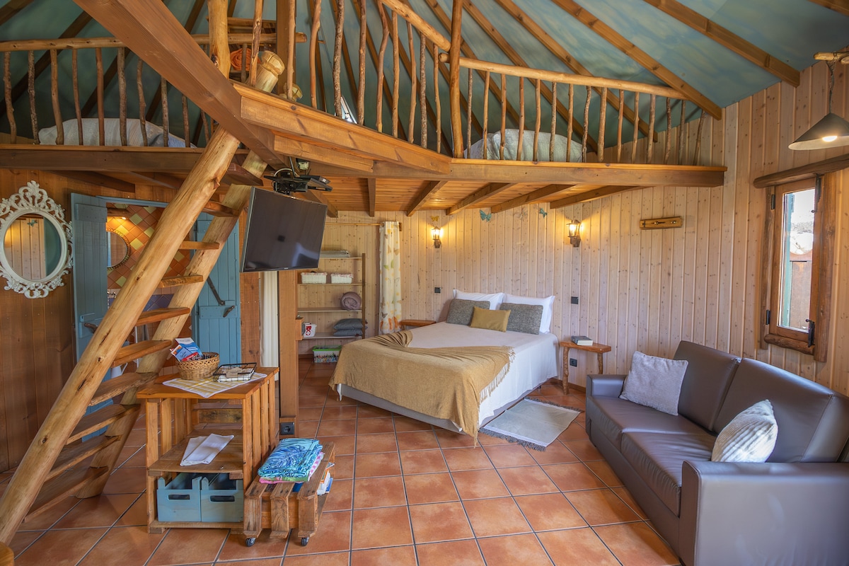 Uma casa de madeira num sitio de extraordinária beleza, com vista para a serra de Monchique e piscina privada. Esta inserido numa quinta com animais, tais com cabras, um burro, galinhas, cães e gatos. Este espaço comum é partilhado com mais 5 casas. Na propriedade de 9 há, que mais parece uma reserva natural privada, existe uma grande biodiversidade e trilhos próprios com recantos calmos onde pode desfrutar.