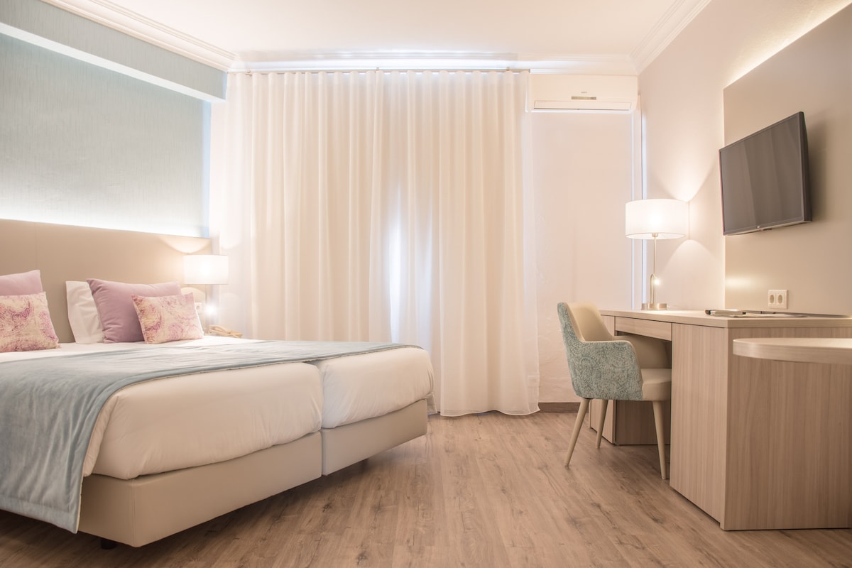 Quarto Duplo - Com uma dimensão entre os 15 e os 20m², os nossos elegantes Quartos Duplo Clássicos dispõem de uma cama de casal, Tv Lcd, secretária com poltrona e casa-de-banho privativa com banheira ou duche. É permitindo o alojamento de um 3º hóspede (taxa extra) ou berço gratuito (mediante solicitação). Quartos com acesso Wi-Fi gratuito. Fabuloso pequeno-almoço incluído!