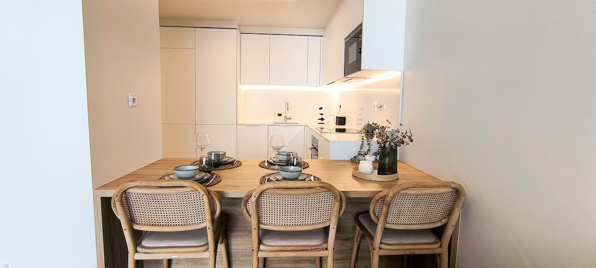 For us, hygiene comes first, we will give you a super clean apartment, Fresh linen and towels from the laundry. The apartment is located between, with on the right side the old town and left the new center with restaurants, shops, supermarket nearby, in a private area without noise . 180º free sea-view. (For exactly see map) Well maintained condominium, large swimming pool with your own sun loungers, children's bath, playground, games room / pool tables, fitness room, squash court, sauna.