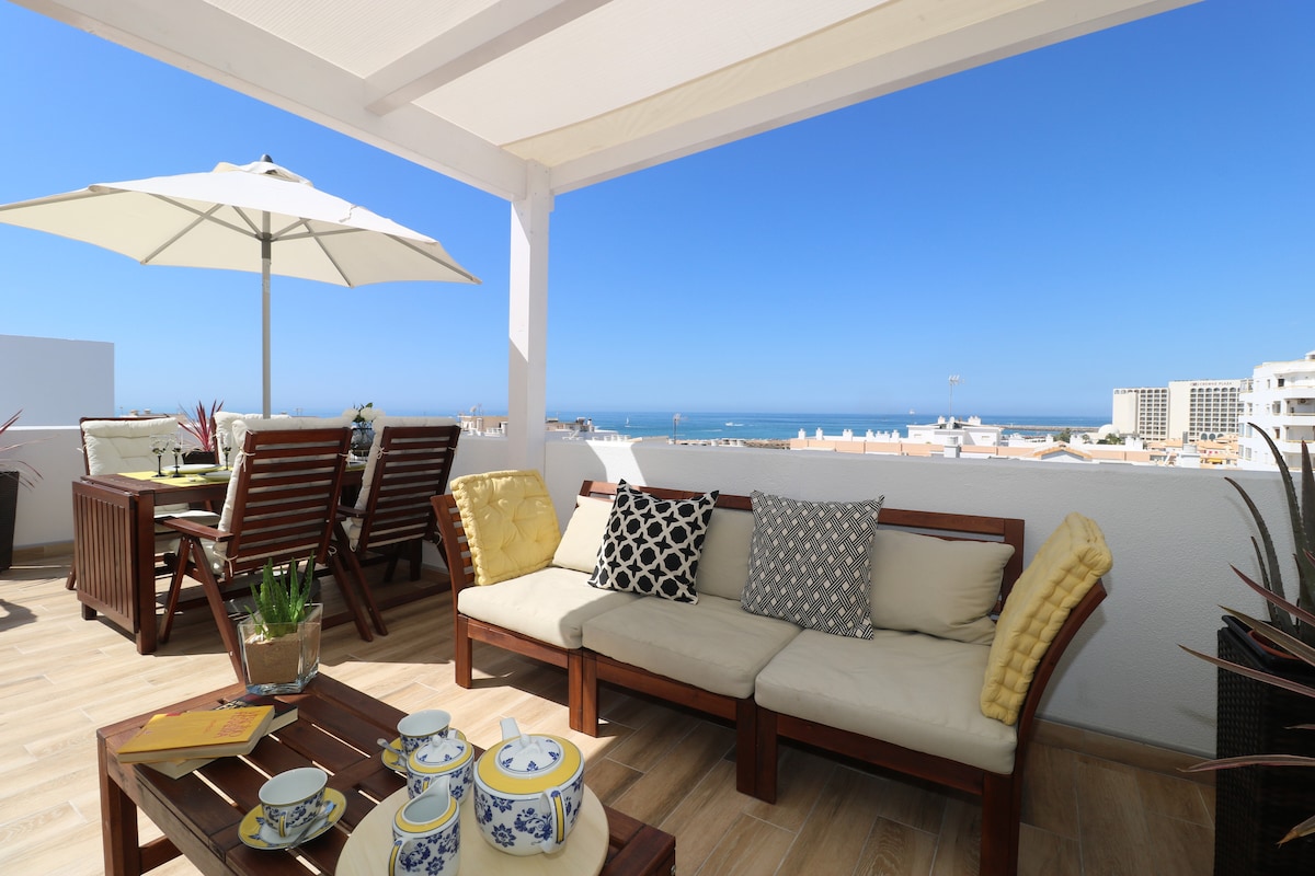 Part of the ‘FantaseaHomes’ rentals collection! • Stunning views of the sea and Ria Formosa National Park • Private terrace / first row sunset 🌅 • Walking distance to buses, trains, and attractions Renovated tiny 1-Bedroom apartment with retro-modern decor and a private terrace offering stunning views of the sea and Ria Formosa National and city. Fully equipped w/ kitchen, cozy living area, modern bathroom. Perfect for relaxing or exploring, with everything you need for a comfortable stay