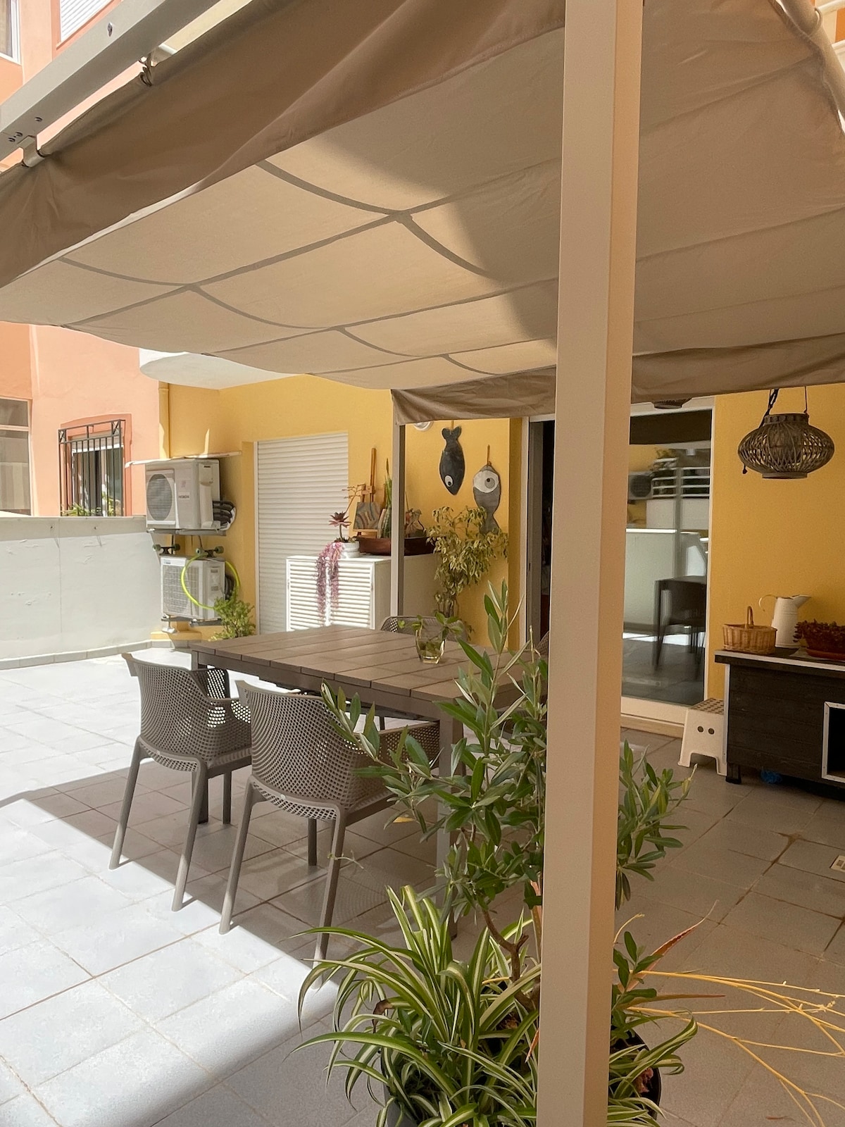 Charming Vintage 2 Bedroom, 2 bathroom Town House with antique furniture and eclectic Art. 5 minutes walk from the sea front and fish market in our favourite coastal town. The spacious roof terrace has great views over the roof tops with loungers, Dining area and shaded pergola. New to 2025 ….immersive under water Art mural awaits you… New to 2026 Air conditioning in all bedrooms and living room. NO CLEANING FEES!