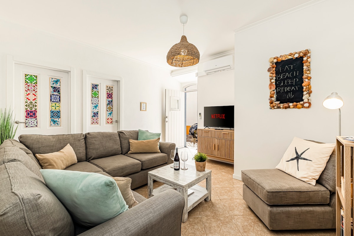 Descubra o charme deste estúdio totalmente equipado, localizado no coração do centro histórico de Albufeira. Com ar condicionado, TV satélite e Wi-Fi, este espaço oferece todo o conforto moderno que você precisa. A decoração em tons de azul e o terraço aberto criam um ambiente acolhedor e relaxante, perfeito para descansar após um dia explorando a cidade.