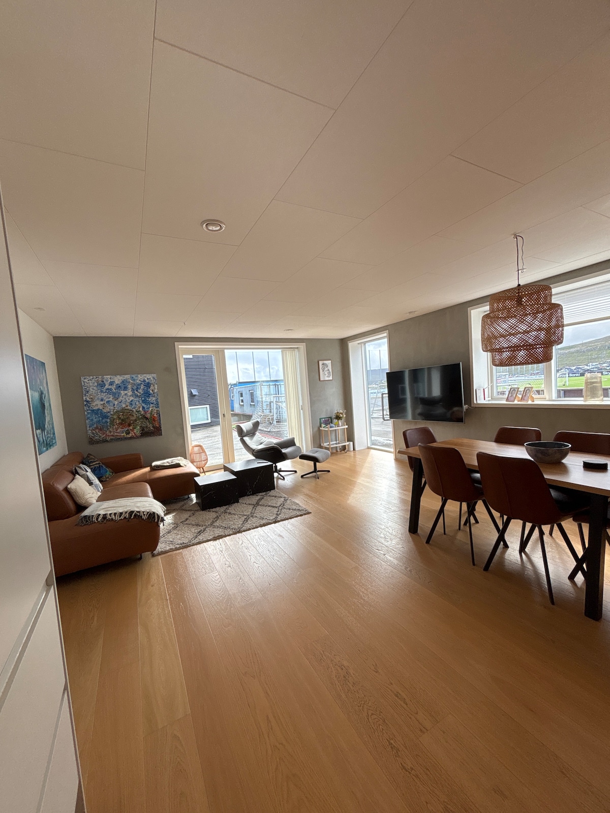 Perfekt sted at tage på ferie, da lejligheden på 75 m2 ligger 15 min fra Tórshavn, 30 min fra populære turist attraktioner feks. Gjógv, Elduvík, Saksun og Tjørnuvík Der er gå afstand til det idylliske "Prestá", hvor der er et lille vand man kan bade i, og gå ture ned til "Prestodda" ved fjorden. I lejligheden er der gode muligheder at lave god mad, og slappe af mens man nyder den fantastiske hav udsigt. Ingen trappetrin ude eller inde. Der er gulvarme over det hele med jordvarmepumpe.