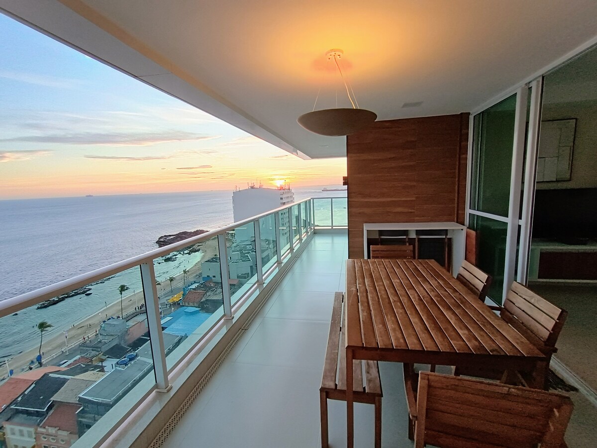 Apt na Barra (bairro turistico) de Salvador, vista mar panorâmica, paralelo ao circuito do Carnaval. 2 min de caminhada ao Farol da Barra. O quarto e sala acomoda até 04 pessoas (quarto cama queen e sala com sofá-cama). Ar condicionado e smart TV em todos os cômodos. Cozinha completa com fogão, forno, microondas, geladeira, filtro de água, cafeteira Nespresso e todos os utensílios Automatizado por Alexa 1 vaga de garagem, rooftop com piscina e academia Lavanderia no térreo PROIBIDO FUMAR