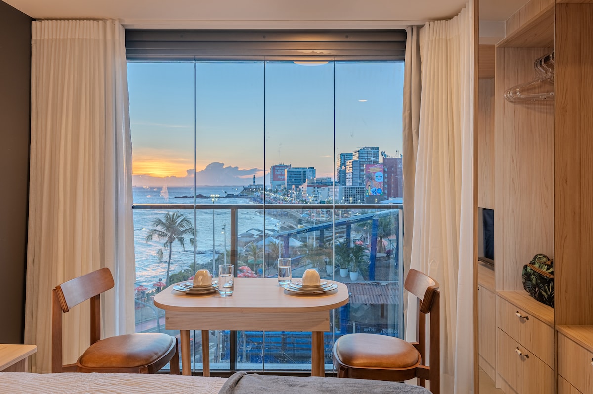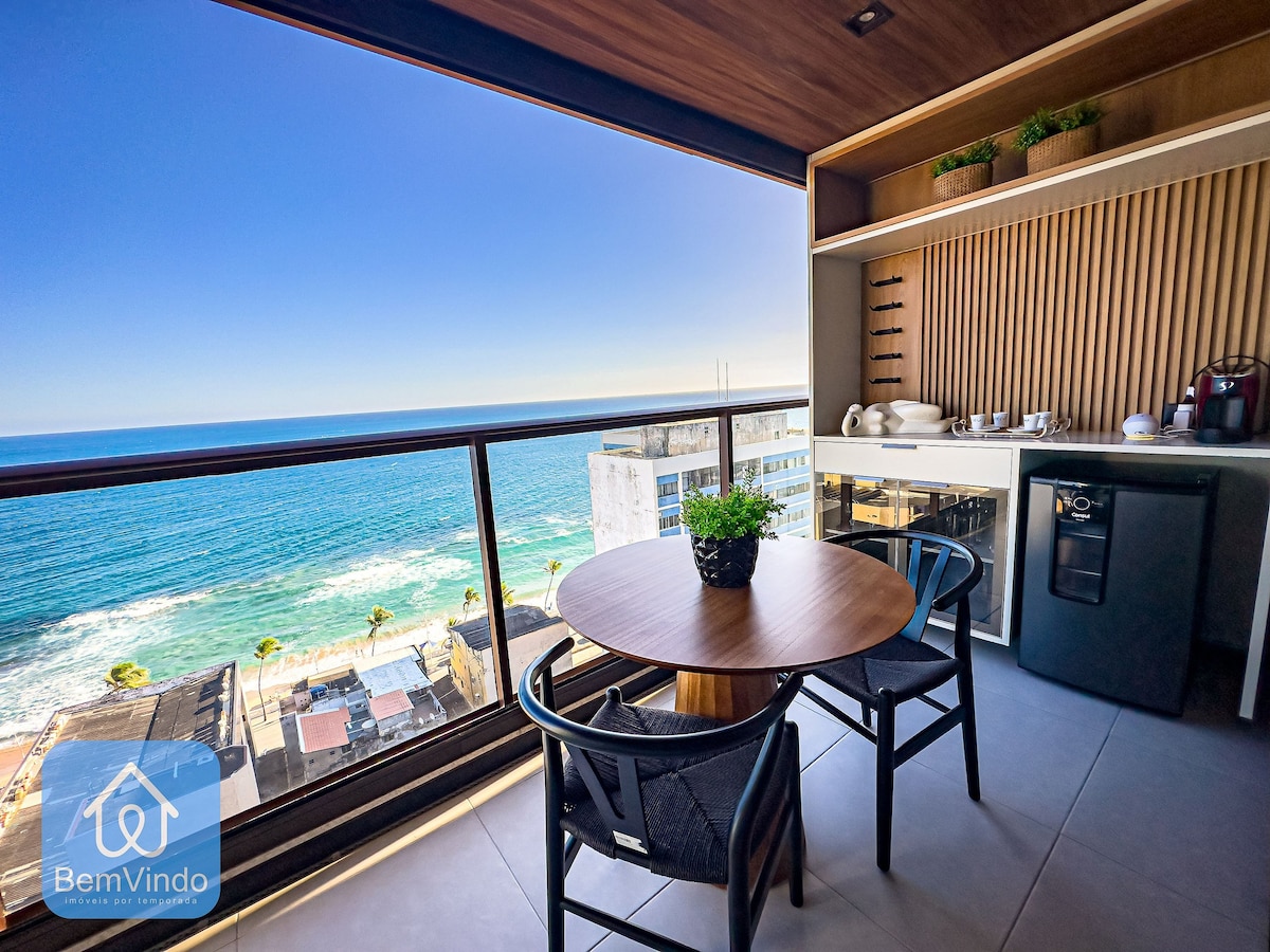Accommodates 2 guests. Ocean view, in the best location for Carnival, with an outstanding view of the entire Oceanic Avenue all the way to Barra Lighthouse. Modern building featuring a swimming pool, gym, Seven Wonders Restaurant on the ground floor serving a delicious and highly sought-after breakfast (paid separately), mini-market, 24-hour front desk, and stunning architecture. Staying in this unit grants free access to the Blue Praia Bar, one of the best beach clubs in Salvador.