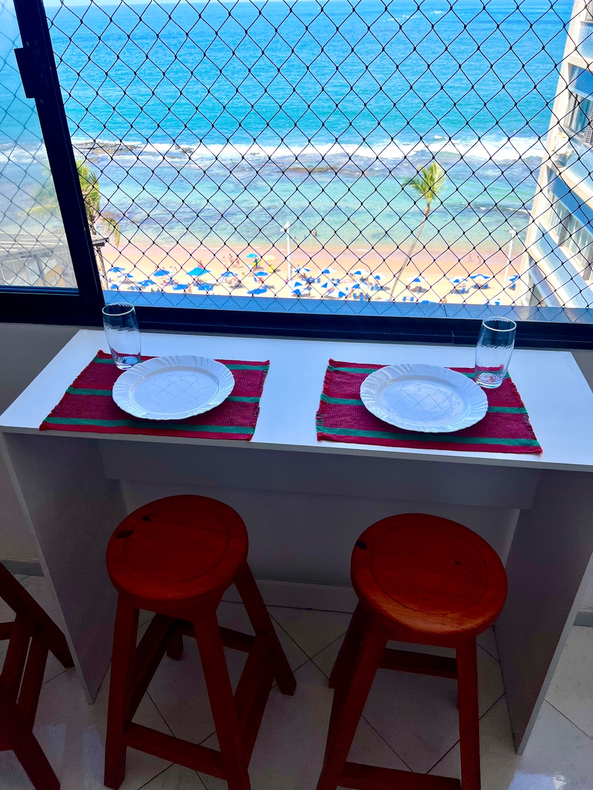 Flat novinho, recém reformado, em frente a praia, com vista lateral para o mar: da varanda é possível apreciar a praia, a avenida e o pôr do sol da Barra. Localizado no melhor ponto da Barra, perto de restaurantes, bares, mercados, farmácias e do Shopping Barra, além de fácil acesso aos principais pontos turísticos de Salvador. Dispõe de ar-condicionado split, ventilador de teto, TV e uma cozinha equipada (sem fogão). O Flat dispõe de camareira para limpeza diária e piscina de uso comum.