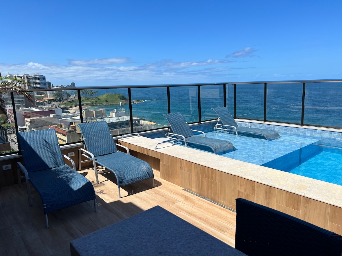 Apartamento todo reformado no FAROL da BARRA , CONDOMINIO BAHIA FLAT, que da nosssa piscina podera apreciar o grande mar, da FAMOSA PRAIA DO FAROL , vendo os trios eletricos , blocos , na area de frente nosso condominio ,que e apenas (dois) min. da praia basta atraverssar a rua , para se deliciar nas aguas encantada do FAROL DA BARRA , temos de 2 elevadores, , estacionamento gratuito, A nossa varanda tem vista para bares da boemia , restaurantes , e hoteis,