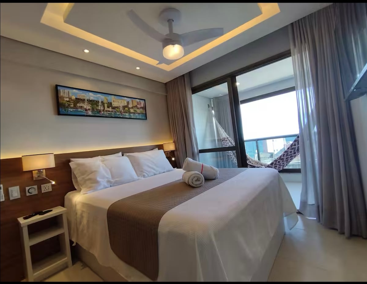 Apart decorado com vista magnífica da Baía de Todos-os-Santos, localizado no circuíto do carnaval, perto do Farol da Barra e Rio Vermelho. Duas suítes com ar, sala, cozinha, Wi-Fi, serviço de camareira, recepção 24h e estacionamento rotativo na frete do Apart. Camas novas, roupa de cama e banho. Smart tv 43, geladeira, fogão, sofá-cama, micro-ondas, liquidificador, sanduicheira, cafeteiras: nespresso e arno e utencílios de cozinha. Piscinas, bar, padaria, retaurantes, lojas, galeria e salão.
