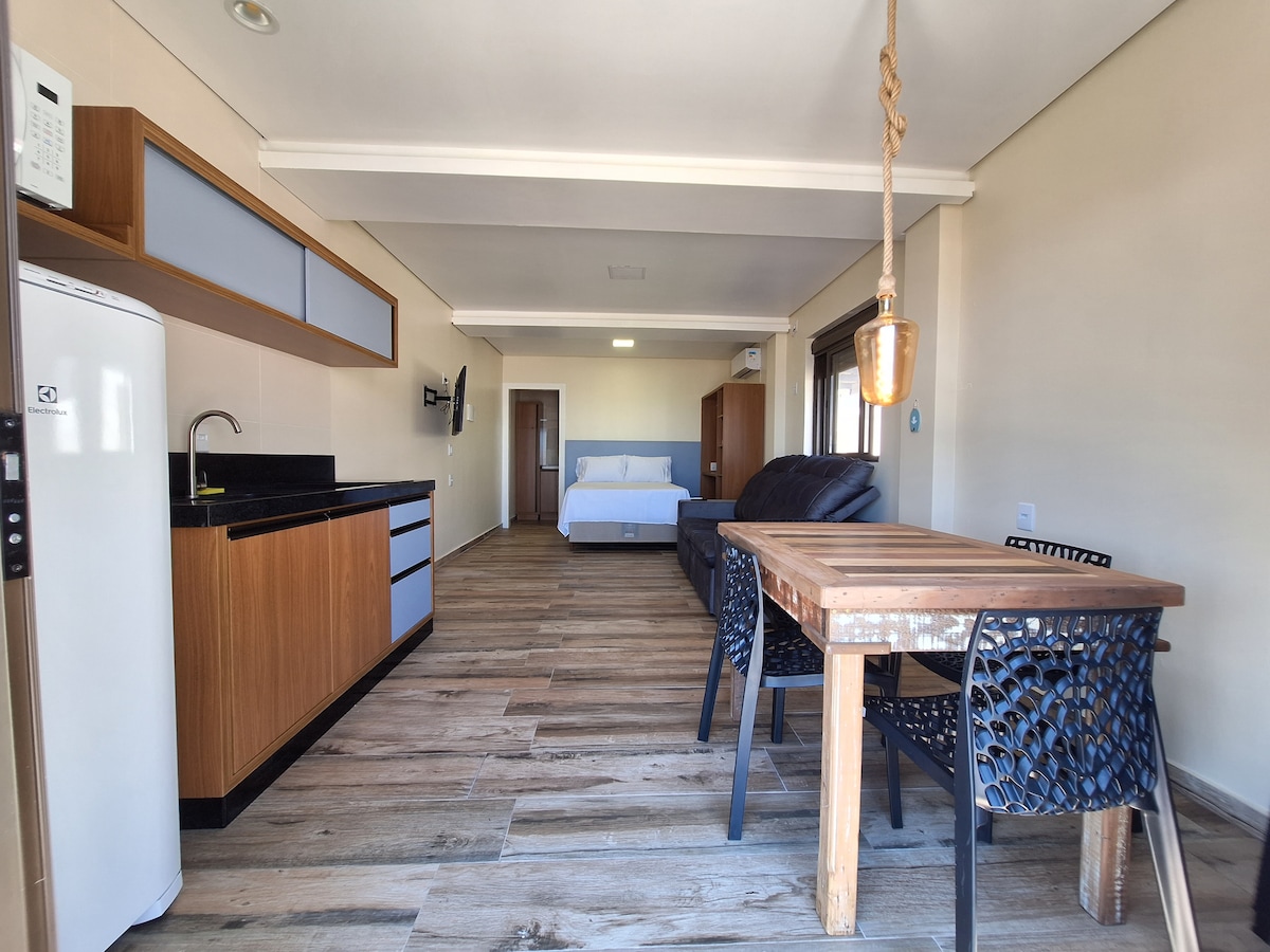 Enjoy unforgettable moments in Balneário Camacho, just one block from the beach. This new and modern loft offers comfort and convenience, featuring a fully equipped kitchen, Smart TV, double bed, air conditioning, and great natural light. Located near the Santa Marta Lighthouse and the famous “Brazilian Nazaré”, it’s perfect for couples or travelers seeking tranquility, exclusivity, and a seaside experience. Book now and enjoy the best of Santa Catarina’s coast!
