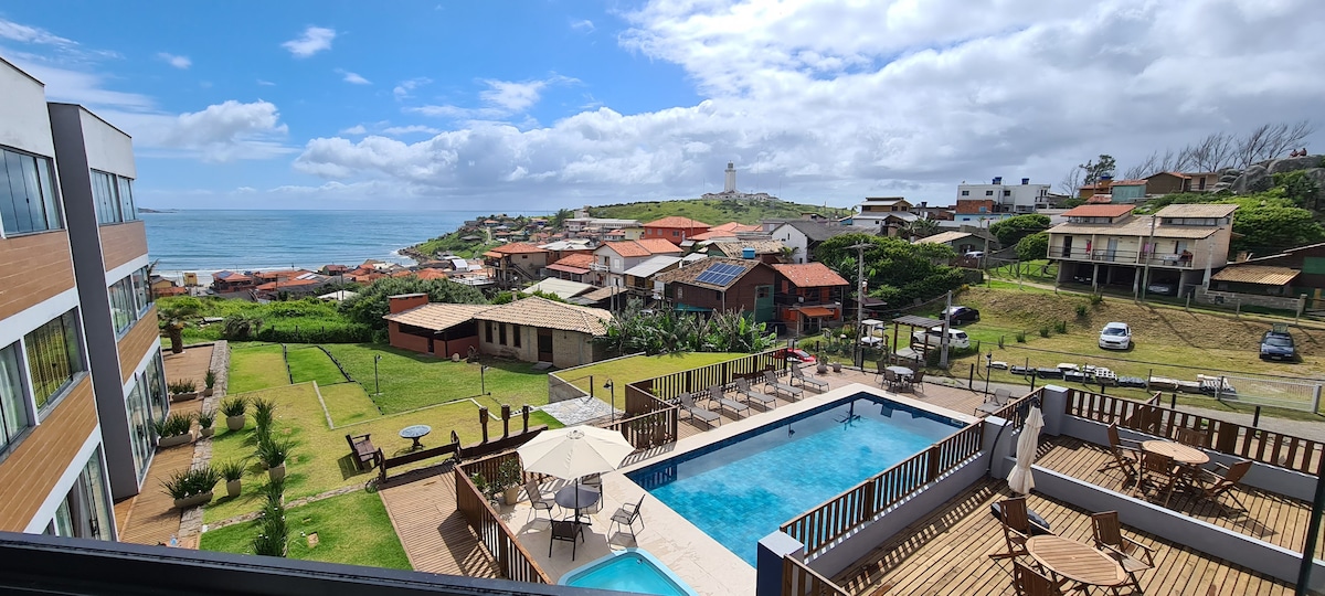 Aproveite a natureza e a paisagem, junto à Prainha do Farol e Praia do Cardoso. Loft novo (35 m²) com vista panorâmica para o Farol e Praia Grande e funcionalidades para seu conforto (wifi exclusiva, smart TV e ar condicionado). Ótimo espaço para casal. Localizado no Residence Farol de Santa Marta, dispõe de piscinas, sala fitness, sauna, sala de jogos, elevador, área externa e churrasqueira coberta. Explore também outras praias próximas, a pé ou de carro, e desfrute da gastronomia local.