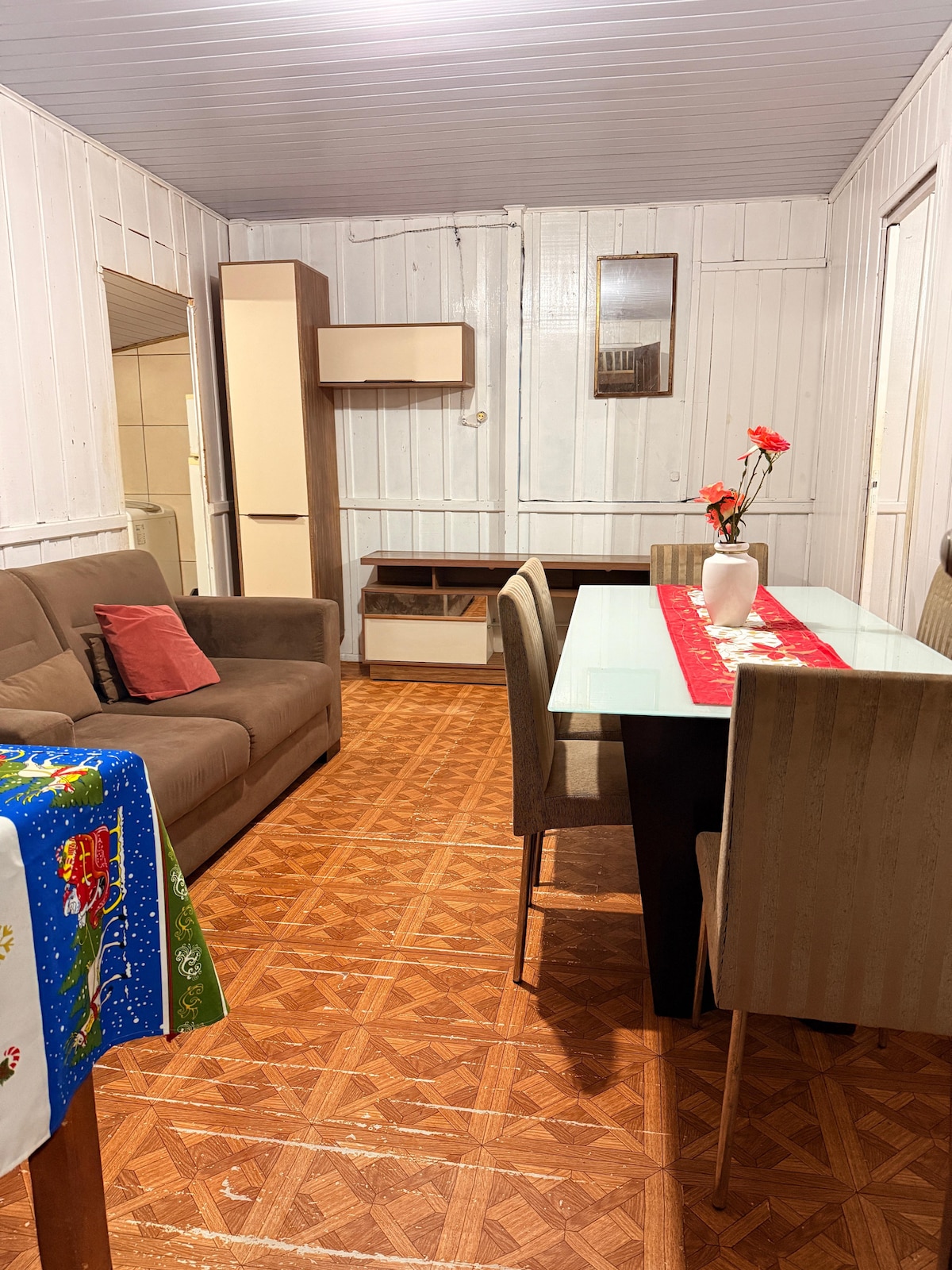 Casa com Ar , Confortavel e aconchegante decorada em estilo rustico moderno, com 2 banheiros, varanda, deck, churrasqueira exterior com cobertura. Fica a 5 min. da balsa na estr. principal do farol SC 100 entre a praia da Galheta e Santa Marta, nossa propriedade lhe oferece um extenso e lindo gramado c/ palmeiras e eucaliptos proximo do mar e da natureza, assim como das lindas praias ao seu redor.
