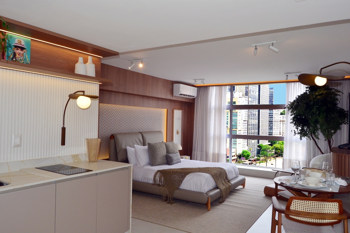 O studio fica no 31º andar do edifício mais alto do centro, com um design moderno e acolhedor, além de uma vista impressionante da cidade. Da janela, é possível admirar o Vale do Anhangabaú, Centro Histórico, as antenas da Av. Paulista: uma das paisagens mais belas de SP. É o prédio onde fica o SampaSky e é possível caminhar para as principais atrações do centro. Conta com ar condicionado, TV de 55'' com apps, cozinha equipada com utensílios básicos, cooktop (1 boca), microondas e frigobar.