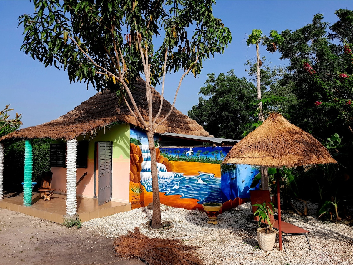 1 case traditionnelle sénégalaise (avec salle de bain équipée) dans un terrain privatif avec très beau jardin. chambre supplémentaire dans maison d'hôte à côté avec salle de bain Climatisation dans la grande case Logement unique A cela s'ajoute une très belle cuisine-terrasse ouverte, ombragée et équipée. situation proche du centre dans un endroit très tranquille (peu de voisinage). Le Village est à 5 minutes à pied. Deux piscines se situent à proximité. Le Siné Saloum est à 5 minutes à pied