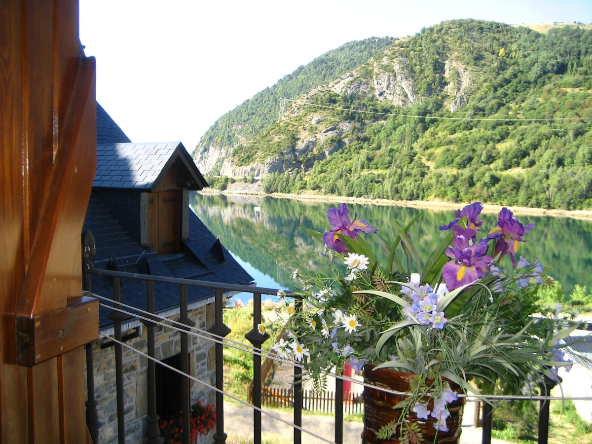 Casa de arquitectura tradicional (piedra, madera y pizarra) en el centro de Lanuza con vistas al embalse y a la zona infantil. Rehabilitada en 2004, está totalmente equipada (electrodomésticos, lencería y vajilla). El entorno, en el corazón del Valle de Tena, junto a las estaciones de esquí de Formigal y Panticosa es un paraíso en cualquier época del año. Estamos a orillas del embalse, rodeados de hermosa naturaleza, al lado de la frontera con Francia, por el puerto de El Portalet.
