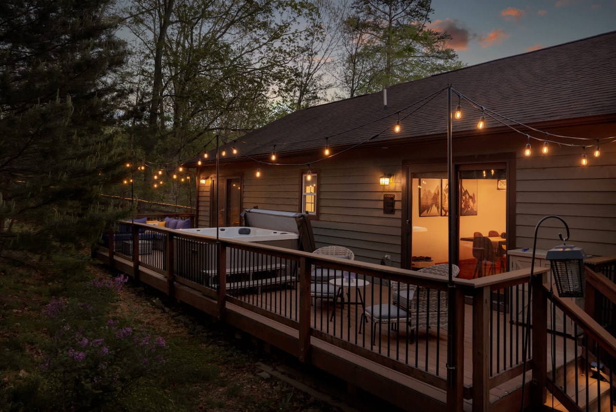 This gorgeous chalet perched on a high hill is surrounded with trees and features an enormous wrap-around deck, HOT TUB, wood-burning fireplace, huge smart TVs and a GAME ROOM for adults and kids with every fun game you can imagine- pool, ping pong, PacMan video arcades, darts and more. Each bed is new and there are king beds and trundle beds to accommodate visitors of all ages. Please note there is an extra charge of $75 for first dog, $25/ea for 2nd/3rd (2nd/3rd dog fees charged later).