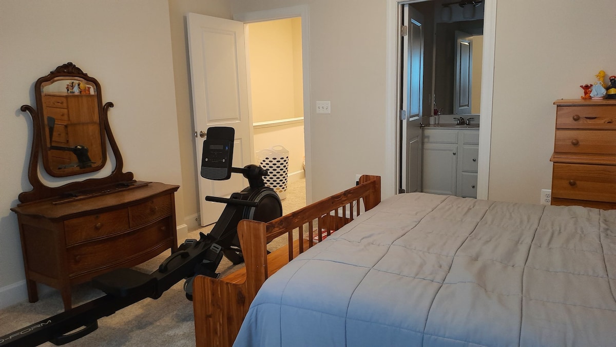 Very sunny room, common bathroom next to bedroom. There is one other private half bathroom in the house. The basement bedroom has treadmill for workout as well as private full size freeze. You can use them if basement room is not occupied. This is corner house so plenty of open space and parking. New double/full bed and mattress. The house has big open deck. Guests are welcomed to use deck. Ps: you can check in anytime but pls book before 10 pm. This is smallest room.