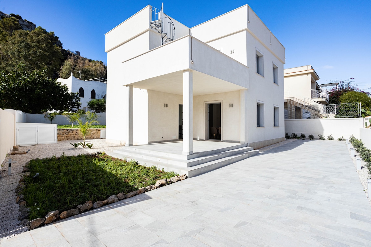 Casa in stile dentro la riserva naturale del Monte Cofano a circa 400 m dal mare con una splendida vista sulla baia di Macari ,contesto naturale esclusivo. La casa era un vecchio rifugio contadino ed è stata ristrutturata con estrema cura dei particolari in tufo e pietra balata. E’ un luogo per gli amanti del relax, natura e privacy. All’esterno il giardino ha vista mare sull'intera baia ed è terrazzato con pietra balata antica e mosaici e una panca in pietra e ceramiche siciliane.