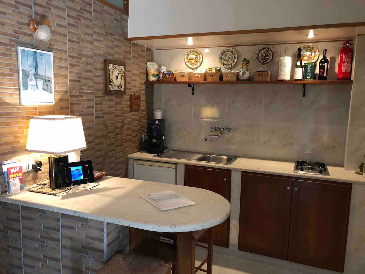 Il monolocale è arredato in stile classico siciliano ed è dotato di tutti i confort offrendo anche la possibilità di consumare i pasti all'esterno sotto un grande ulivo. Al ritorno dal mare è possibile usufruire di una doccia supplementare situata all'esterno dell'abitazione in un angolo appartato vicino al prato. Il monolocale si trova in una località vicina al mare ma a due passi dalla città e sulla strada per San Vito lo Capo raggiungibile in meno di mezz'ora. La località è molto tranquilla ma permette di raggiungere il centro della città in pochi minuti.