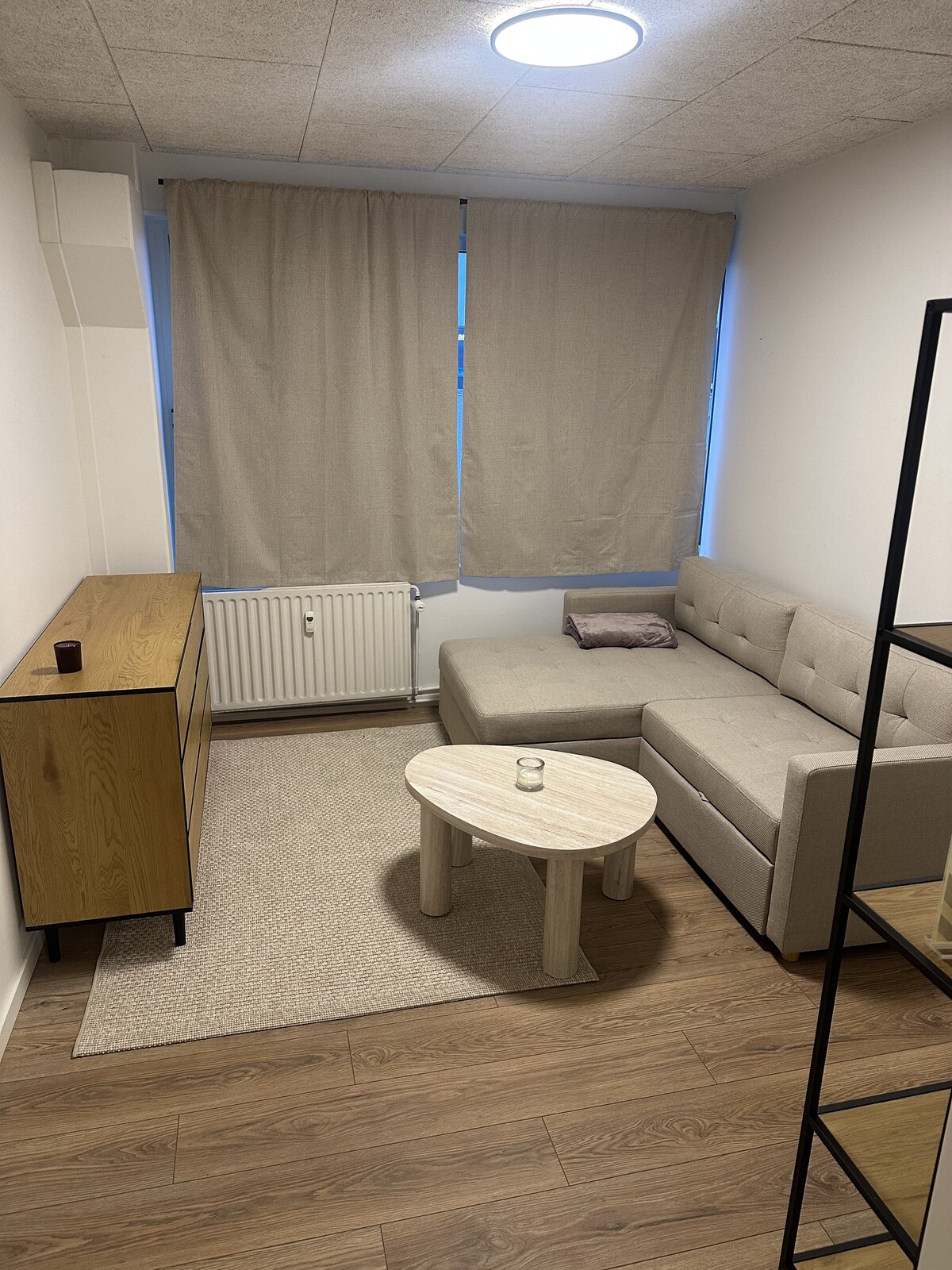 Her har du en privat bolig der ligger i kort afstand til offentlig transport, indkøb og skøn natur. Du har din egen lejlighed med privat indgang, eget toilet og fuldudstyret køkken. Lejligheden er inddelt i stue og soveværelse. I stuen forefinder du en sofa, der kan omdannes til en bekvem to-personers seng, samt bord med plads til 4 personer. Soveværelset rummer to enkeltsenge, der snilt kan omdannes til en dobbeltseng. Lejligheden ligger i rolige omgivelser med umiddelbar parkering tilknyttet.