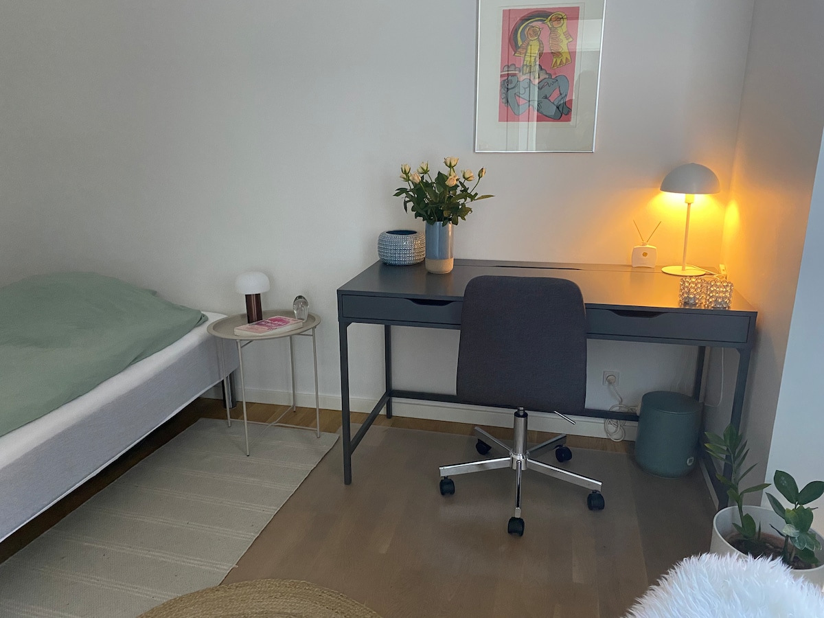 Cozy ground-floor apartment with 2 bedrooms: one with a 140x200 cm bed, the other with a 180x200 cm bed. Duvets, pillows, bed linen, and towels included. Shower and cooking allowed. TVs with Chromecast in both bedrooms, WiFi and TV with Netflix in the living room. Terrace with table + 4 chairs. Space for 1 extra person on the sofa. The apartment is only 200m from the rail to Aarhus C (10 min). Buses are also nearby and the popular Bellevue Beach is just 2.5 km away. Rental bikes are close by.