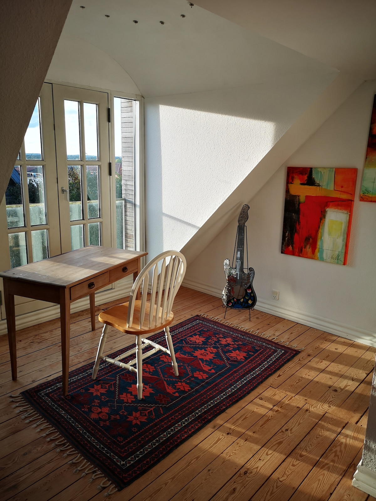 Slap af i denne unikke og rolige bolig. Fra boligens øverste etage er der en fantastisk udsigt over mark og skov, hvor vi ofte ser rådyr og andre dyr. Spis ude når vejret tillader det ved det dejlige havemøbelsæt lige uden for døren. Der findes sovepladser på hver etage, så er I to par, eller to kollegaer, eller forældre og større børn, kan man sove hver for sig. Vi har landbrug, så der er mulighed for at spotte en traktor eller andre landbrugsmaskiner i aktion.
