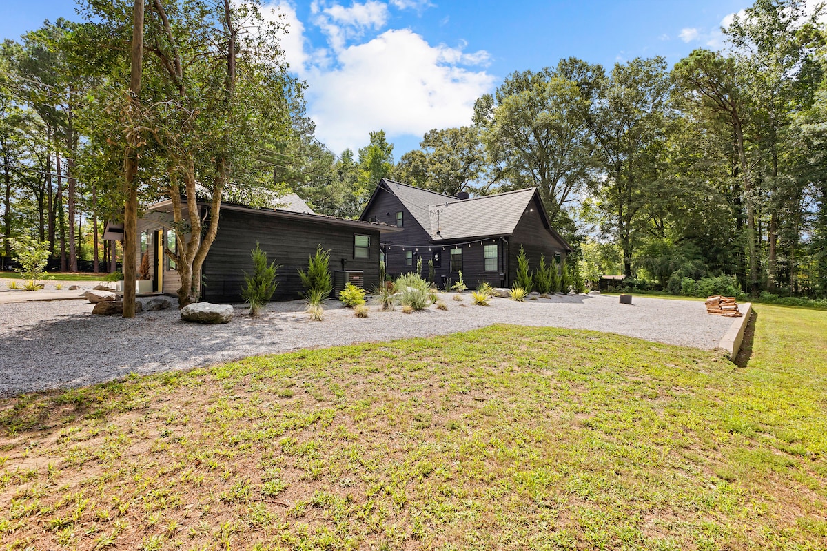 A spacious and peaceful mid century modern compound (main house and guest house) tucked away behind a wooded path. Only about 35 minutes from downtown Atlanta, and minutes from Trilith Studios/Live, US Soccer training facilities, Piedmont Hospital, & QTS data center, our location is super convenient for groups coming to the area for fun, work, family, or business. Fully furnished and stocked with amenities, our home is perfect for groups looking for their short or mid term retreat.