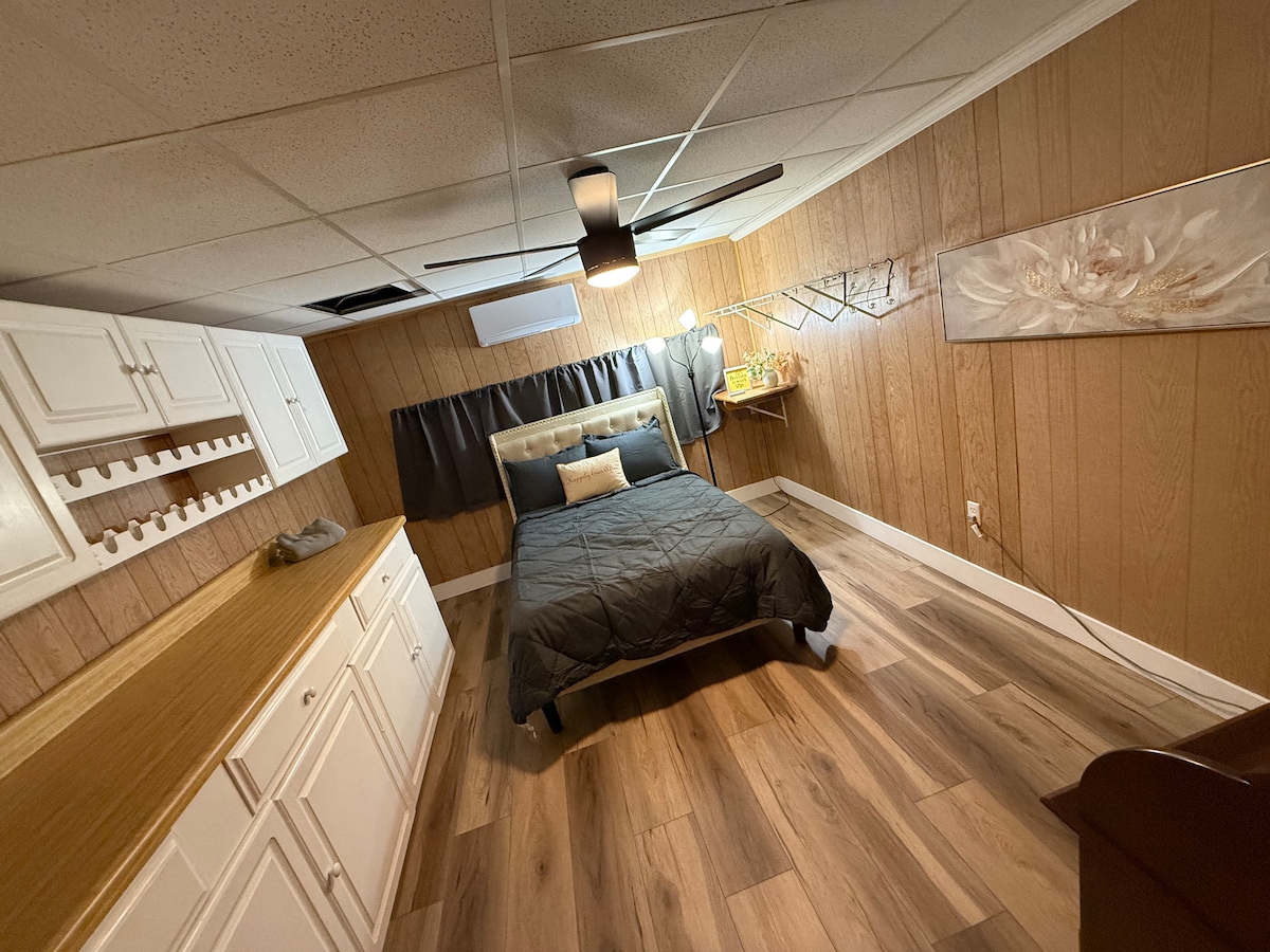 Newly renovated basement studio apartment featuring an eat-in kitchen, living room with pull out sofa bed, workstation area, one queen sized bed, one bathroom with shower and private yard with covered patio. Two assigned parking spots are located on the property. The apartment is equipped with high speed Wi-Fi, Smart TV and new appliances. Toys, outlet covers and pack n' play available upon request. Located near golf cart / walking / bike trails.