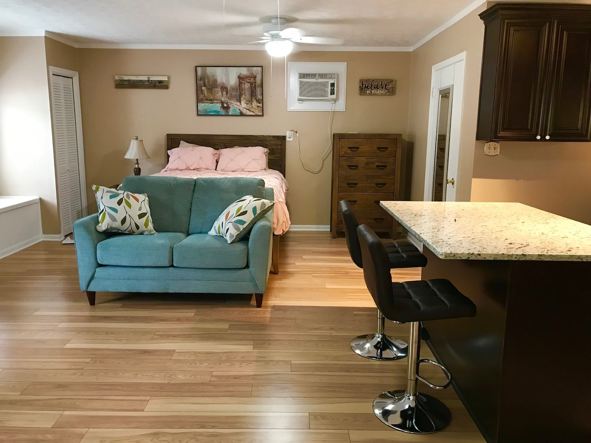 Take a break and unwind at this peaceful oasis. Cozy 1 bedroom, 1 bath private guest space on 5 acre executive property in Fayetteville. One bedroom with king bed, full bathroom, large walk-in closet. Living room with TV. Kitchen with oven, stove, bar seats for eating. Washer and dryer included. Private pickleball court available from 10a-3p. Please message host when using court. Paddles and balls available onsite. Please note court being refinished. 30 day min. This is a no smoking property.