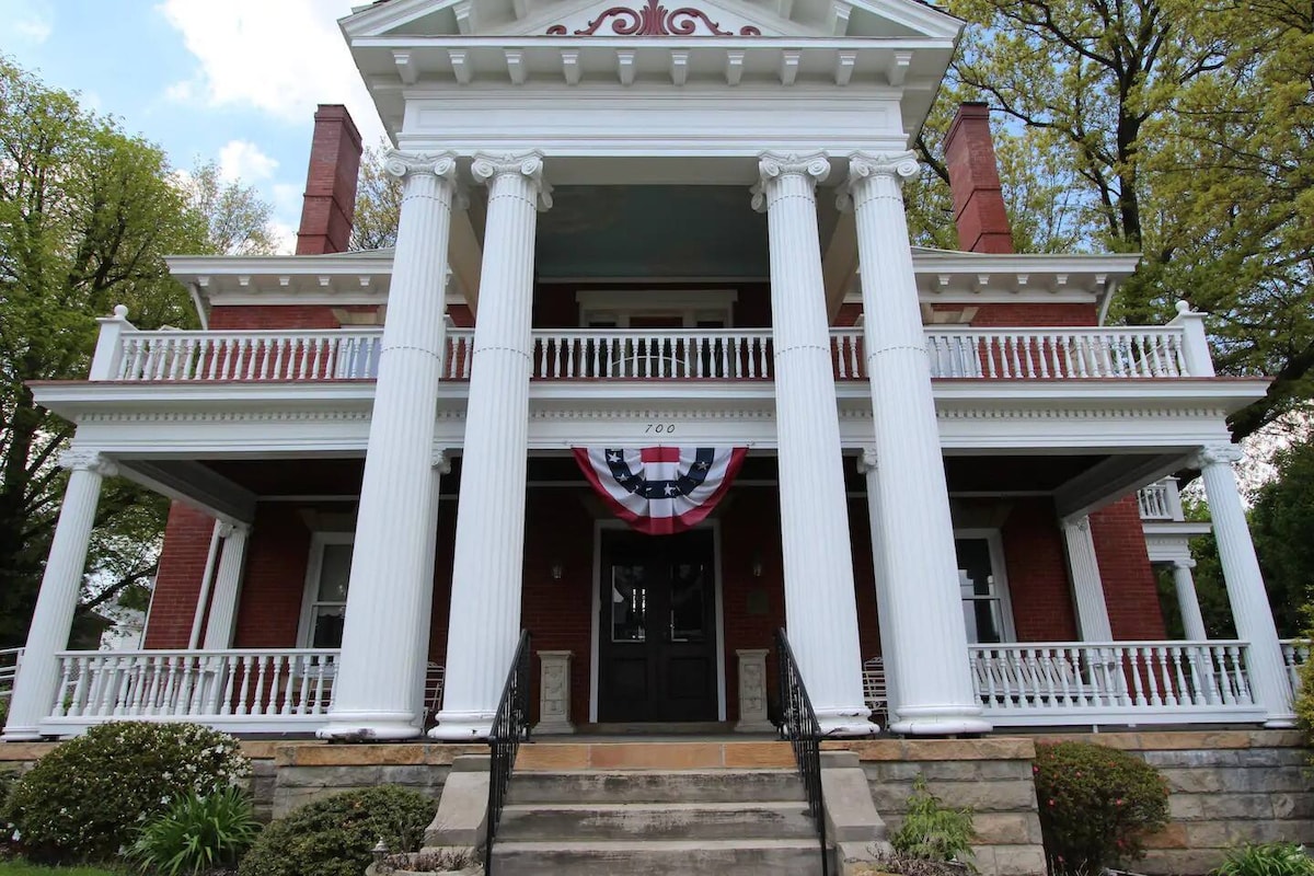Award winning 1904 Georgian mansion near Frank Lloyd Wright Fallingwater in the beautiful Laurel Highlands. Elegant 2 fl. suite, fireplace, en-suite bath with original antique claw foot tub/shower. Features faux bois woodwork, Tiffany windows, high-end bedding, antiques and art. A./C. Roku TV & wi-fi, FREE parking, Breakfast 9am-10am Check out 11 am.