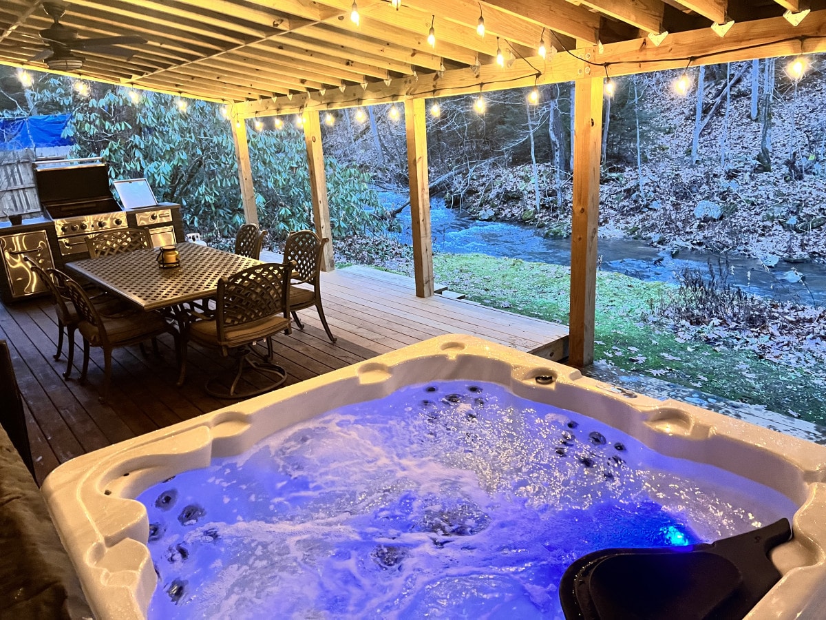 舒适的溪边小屋、亭子、热水浴缸、火坑