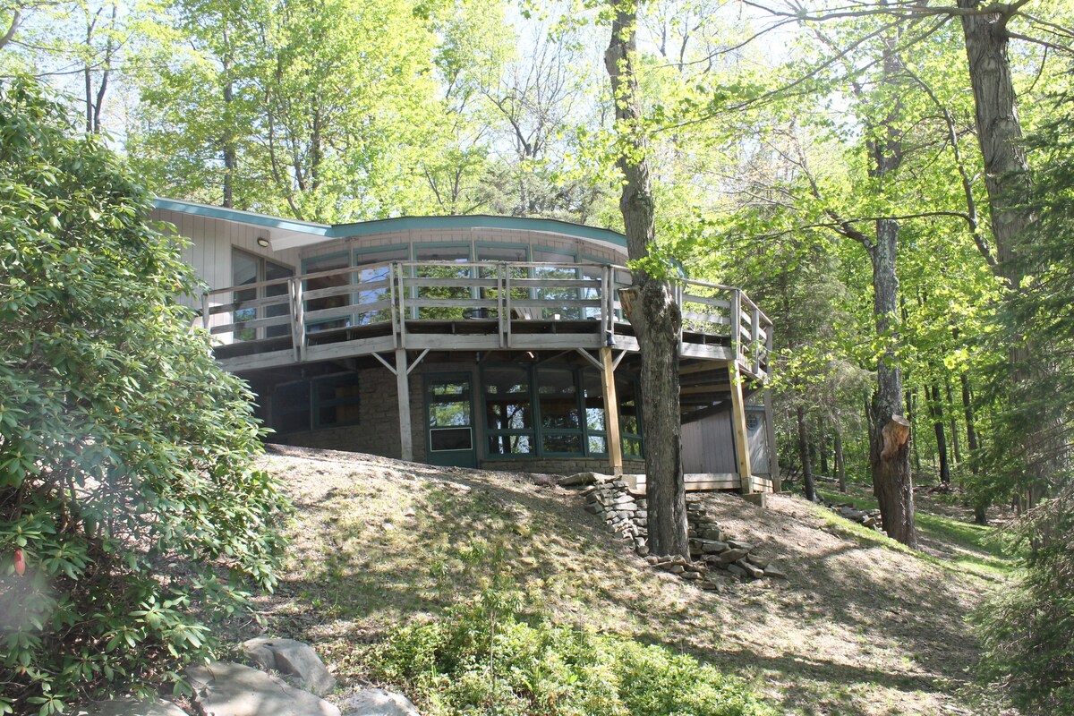 Smiling Mountain is a hand hewn wood, stone and glass tree house close to Seven Springs, Hidden Valley Fallingwater, and the GAP Trail. This 4BDR, open floor plan home features 19' accordion glass door that opens onto an elevated deck. Complete with 2 wood burning fireplaces, gourmet kitchen, dining table for 12 (one inside, and one outside), the house showcases art from world travels and hand-made light fixtures. Steps away from the Roaring Run Nature Area- Hike, Bike, Ski or just relax.