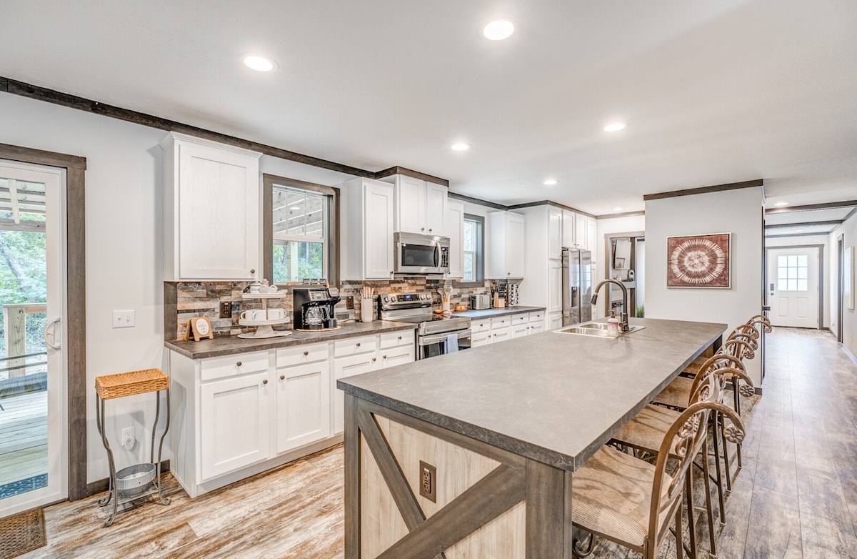 Fire up the Grill! Wide drive with parking for trucks and trailers w/ 2 enclosed buildings to park and secure your stuff! Fully stocked kitchen , 7 acres with huge new covered deck, complete re-model of this manufactured home in spring '22! Your crew will LOVE staying here! Brand new Stearns and Foster and Sealy Hybrid Mattresses - 6 beds in 3 bedrooms. Work space with printer, internet, etc. Firepit, coffee bar, all new bedding, super clean stocked with plenty of supplies!