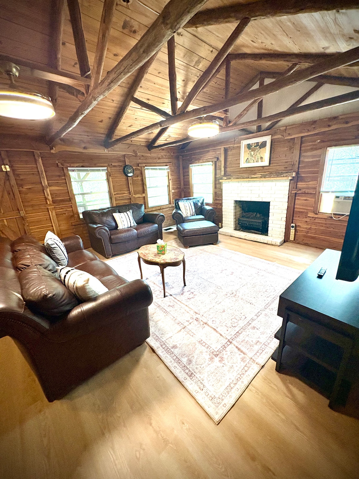 Resting among heavily wooded and hilly property stands a multi-level cabin we call the Treehouse. It is located minutes from downtown La Grange. The front porch overlooks a small pond and has rocking chairs. A full kitchen is equipped with everything you need, dining room with a large table and grand living room, bathed in natural light from large windows. The Treehouse has three bedrooms and 2 full bathrooms and can sleep 7 comfortably. There is a bunk room accessible from the Master Bathroom.