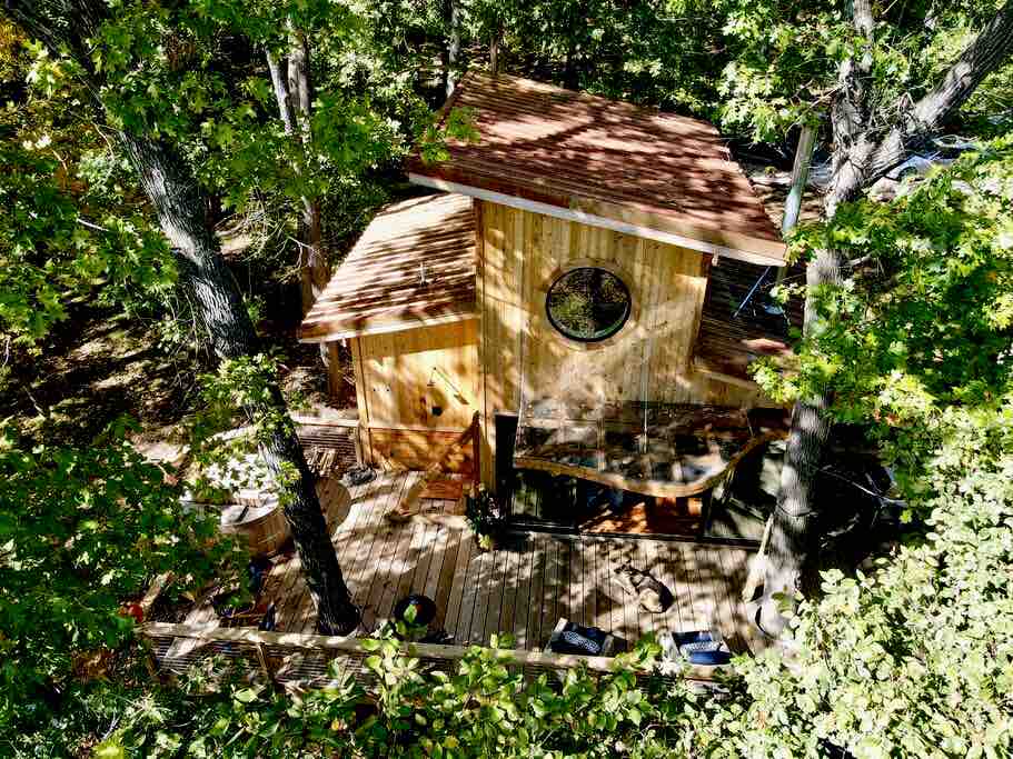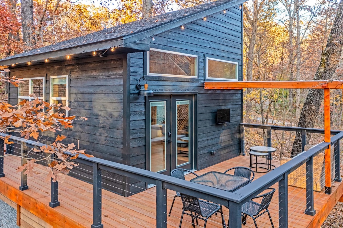 Welcome to Pedal and Perch, a custom-designed and built accessory dwelling cabin just minutes from downtown Bentonville, AR, Walmart HQ, and miles of incredible mountain biking. Enjoy a serene setting that tucks you among the trees and makes you feel like you are staying in your own treehouse. The cabin features a custom kitchen, one bathroom, a queen bed in the loft, a pullout sofa on the primary floor, and your very own outdoor bathtub looking in to the valley below.