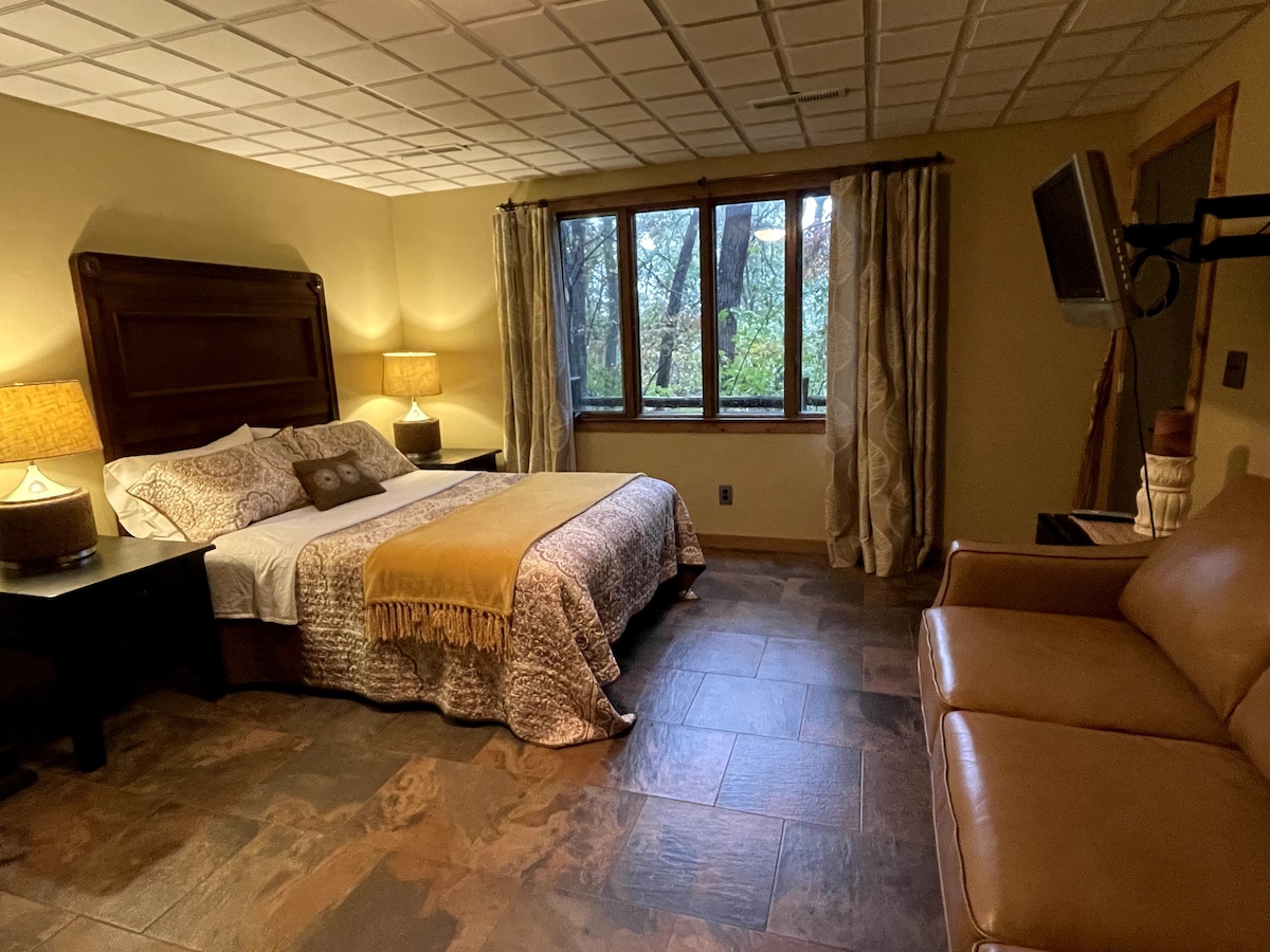 The 650 sq ft apartment is on the first floor of a home nestled on the side of Mt. Kessler, surrounded by woods on three sides. You'll have your own separate keypad entrance, full bath, kitchenette, TV, walk-in closet, and two rooms-one bedroom with a full-size bed and one with a pull-out full-size sofa sleeper. The kitchenette has a large fridge, microwave, and stocked Keurig coffee maker. Enjoy your coffee on one of the many hammocks and hanging chairs outside the apartment and on the gazebo.
