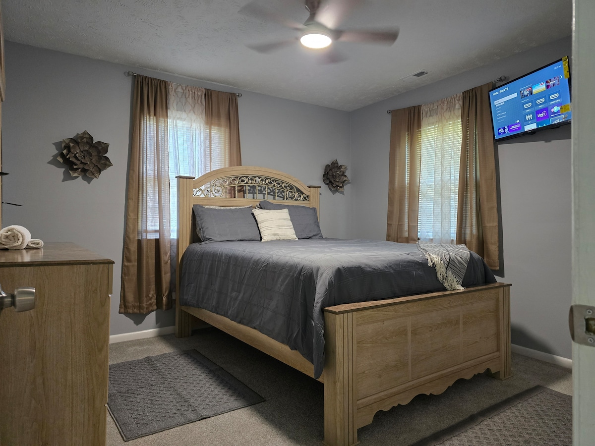 Perfect for family visits or small groups, this private Fayetteville suite comfortably accommodates up to three guests. Enjoy a 65-inch TV in the living room and a 55-inch TV in the bedroom, both with Netflix, Disney+, Premier, and Jellyfin. The bedroom features a king-size bed for two adults and an infant, while the living room has a queen sleeper sofa for one adult or two children. With a fully equipped kitchen, workspace, bathroom, laundry room, and enclosed yard, it’s perfect for any stay.
