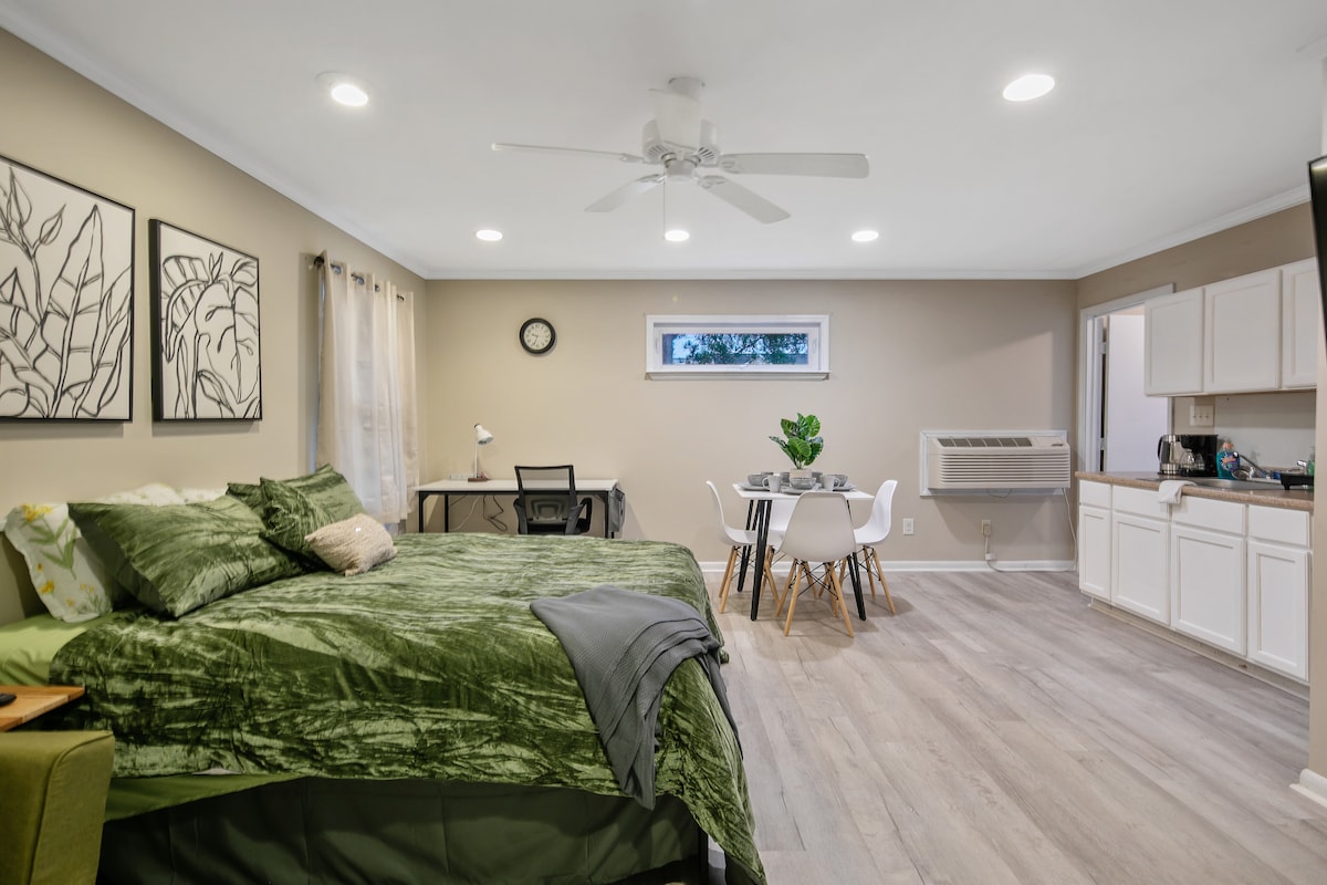 Studio apartment above the garage with private entrance. Space features a bedroom with king size bed, full bath, kitchen and living space combined. Located in Fairfield neighborhood which is quiet and beautiful. Residents are mostly retired from military with few dispersed professionals such as doctors and nurses. It is attached to another listing properly termed Southeastern Oasis.