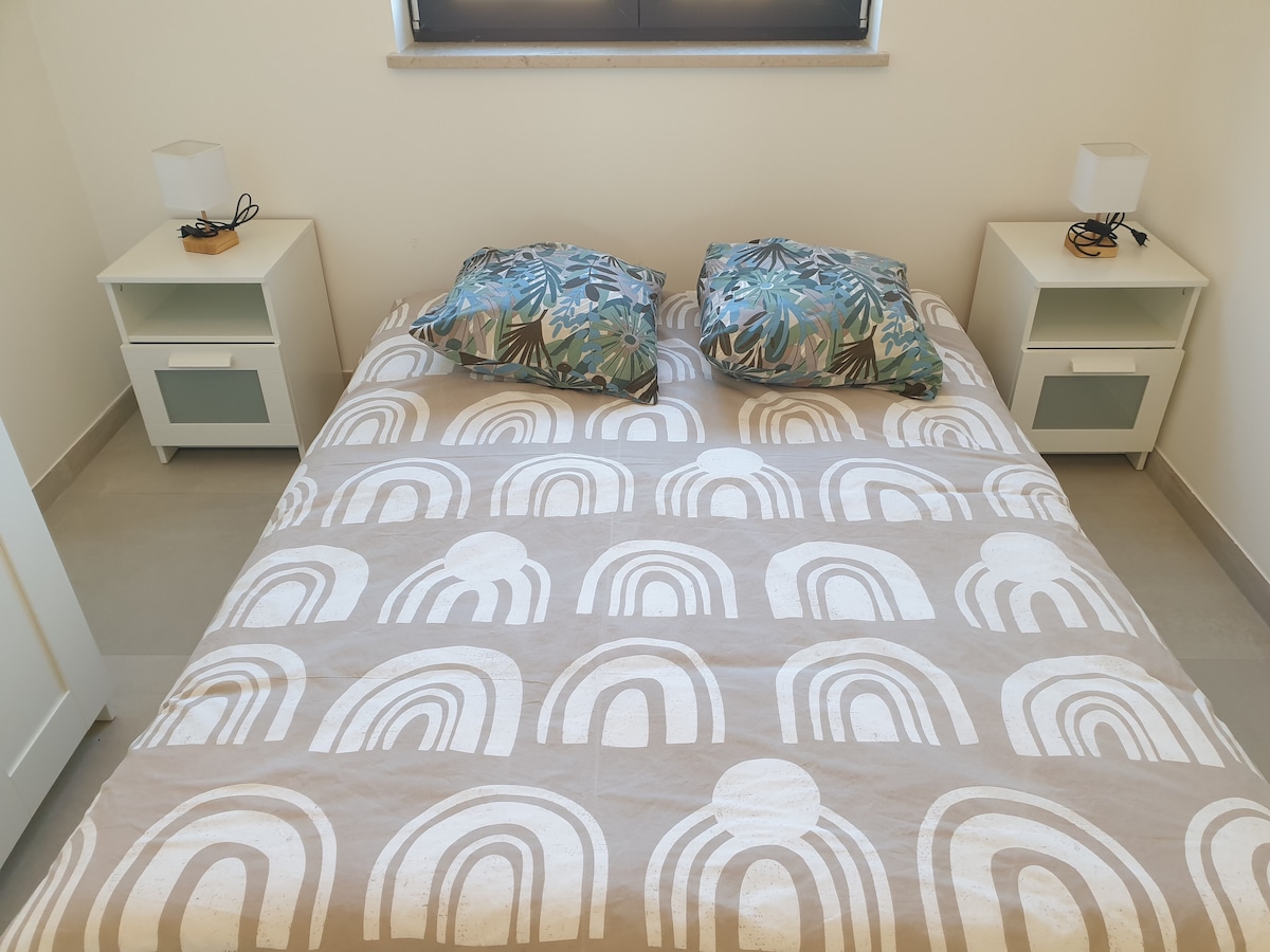An apartment situated on the first floor, above the garden, 65 m2 big + balcony 18 m2 consisting of: Master bedroom with double bed,180 cm x 200 cm TV SAT, fully equipped kitchen (oven, fridge, dish-washer, coffee appliance) with a dining table, air condition, private bathroom with shower and bidet. Highlight: The apartment has a large private balcony 18 m2, on the south - western side of the house. Our guests usually have breakfast on this balcony with a wooden furniture set.