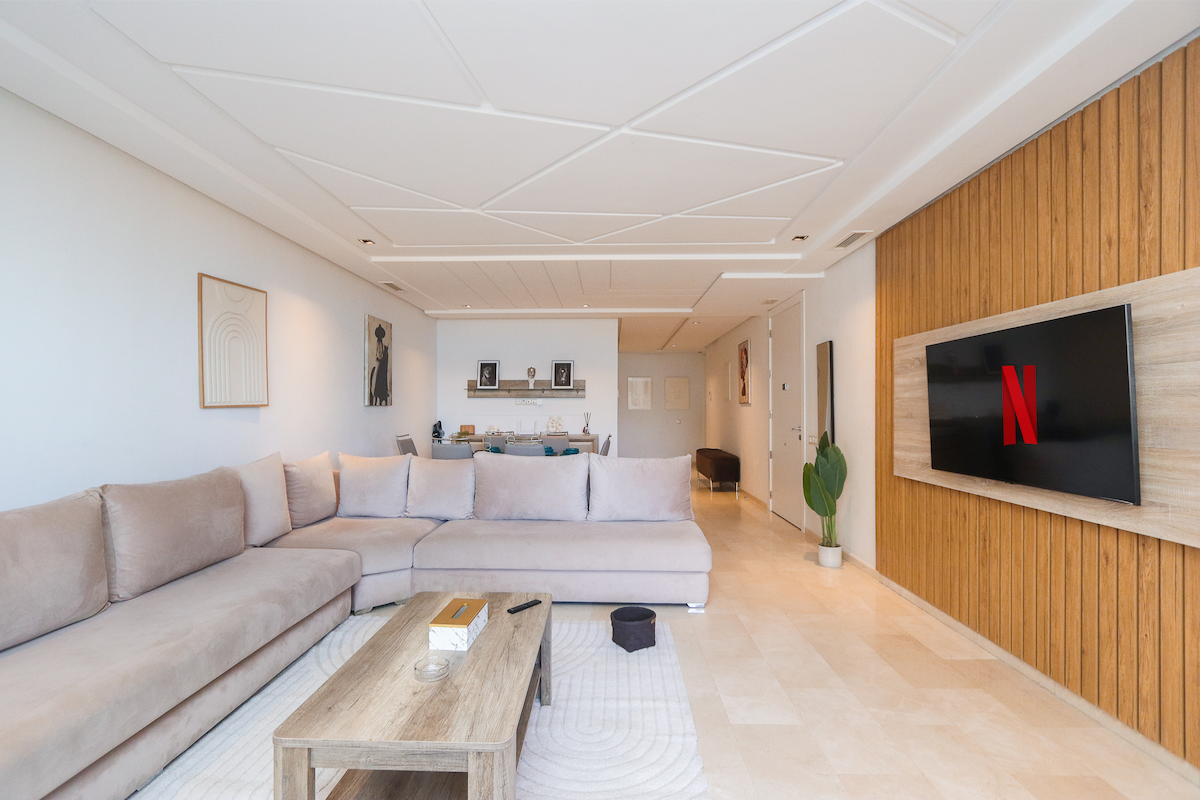 Appartement moderne et spacieux à Tanger, idéal pour un séjour calme. Grand salon avec Wi-Fi, salle à manger familiale, cuisine équipée et terrasse cosy avec vue sur la ville. Suite parentale avec espace de travail et lit bébé, deuxième chambre 2 lits, deux douches et clim centrale. Résidence sécurisée avec piscine, parfait pour vacances, familles ou détente.