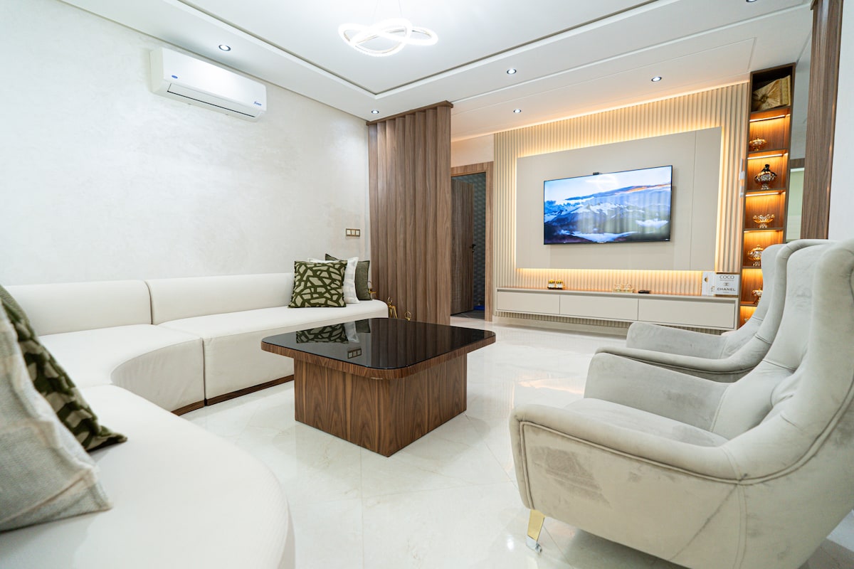 Appartement moderne et spacieux à Tanger, idéal pour un séjour calme. Grand salon avec Wi-Fi, salle à manger familiale, cuisine équipée et terrasse cosy avec vue sur la ville. Suite parentale avec espace de travail et lit bébé, deuxième chambre 2 lits, deux douches et clim centrale. Résidence sécurisée avec piscine, parfait pour vacances, familles ou détente.