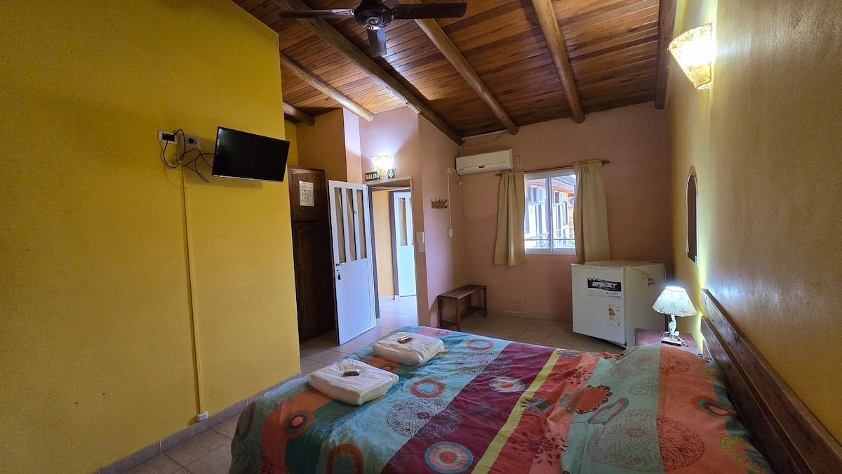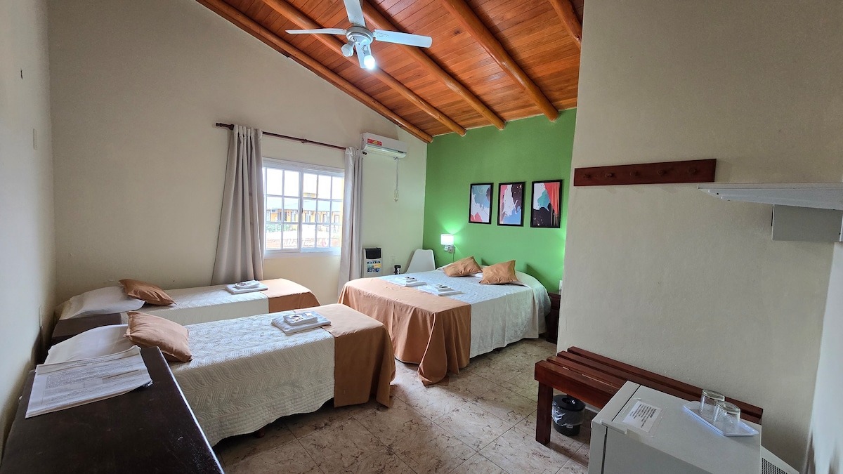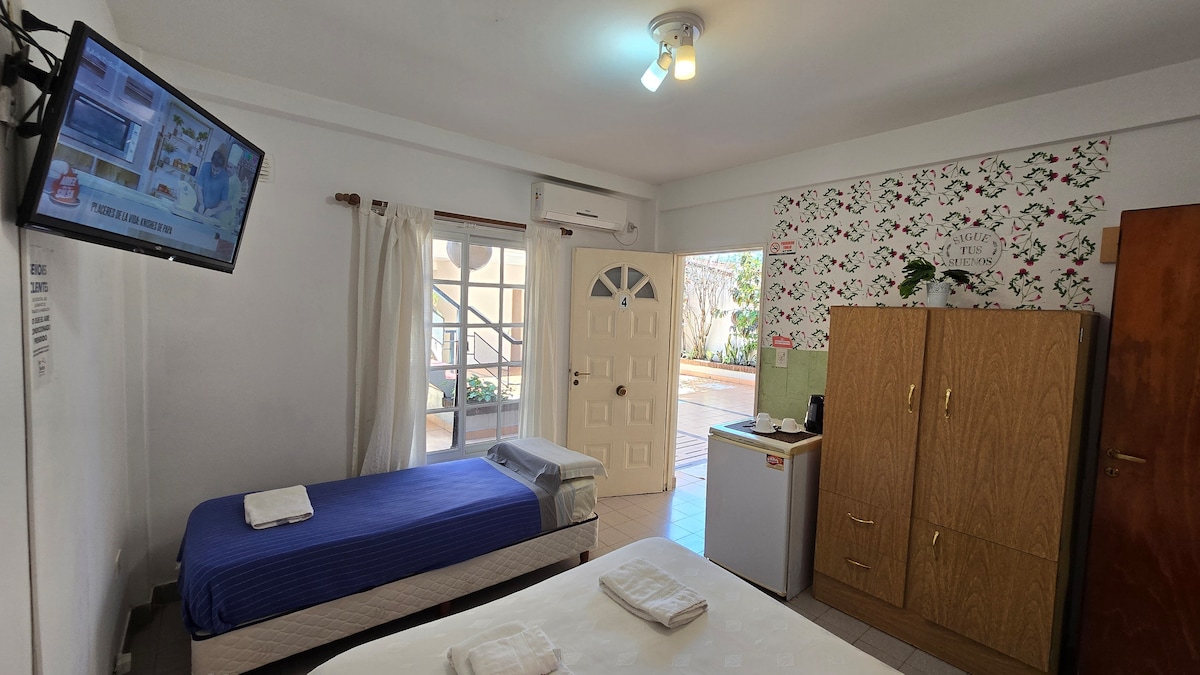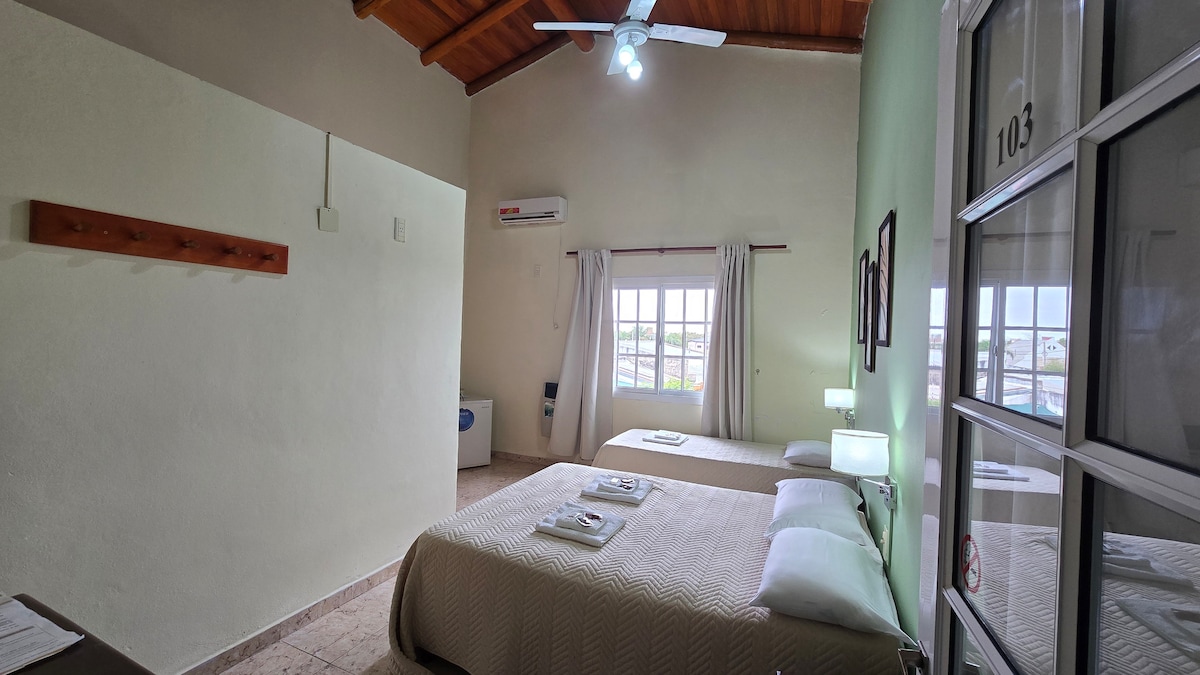 Privilegiada ubicación (a 3 cuadras de termas y 2 de terminal de micros, en zona centro). monoambiente totalmente equipado (heladera, anafe, juguera, cafetera, licuadora, tostadora, utensilios de cocina y vajilla, secador de pelo), cuanta también con split frio/calor y ventilador de techo ultra silencioso. hermoso jardín con piscina y espacios comunes al aire libre, cuenta también con zona de parrilla con todo lo necesario. Disponemos también de desayunos a la carta con costo adicional.