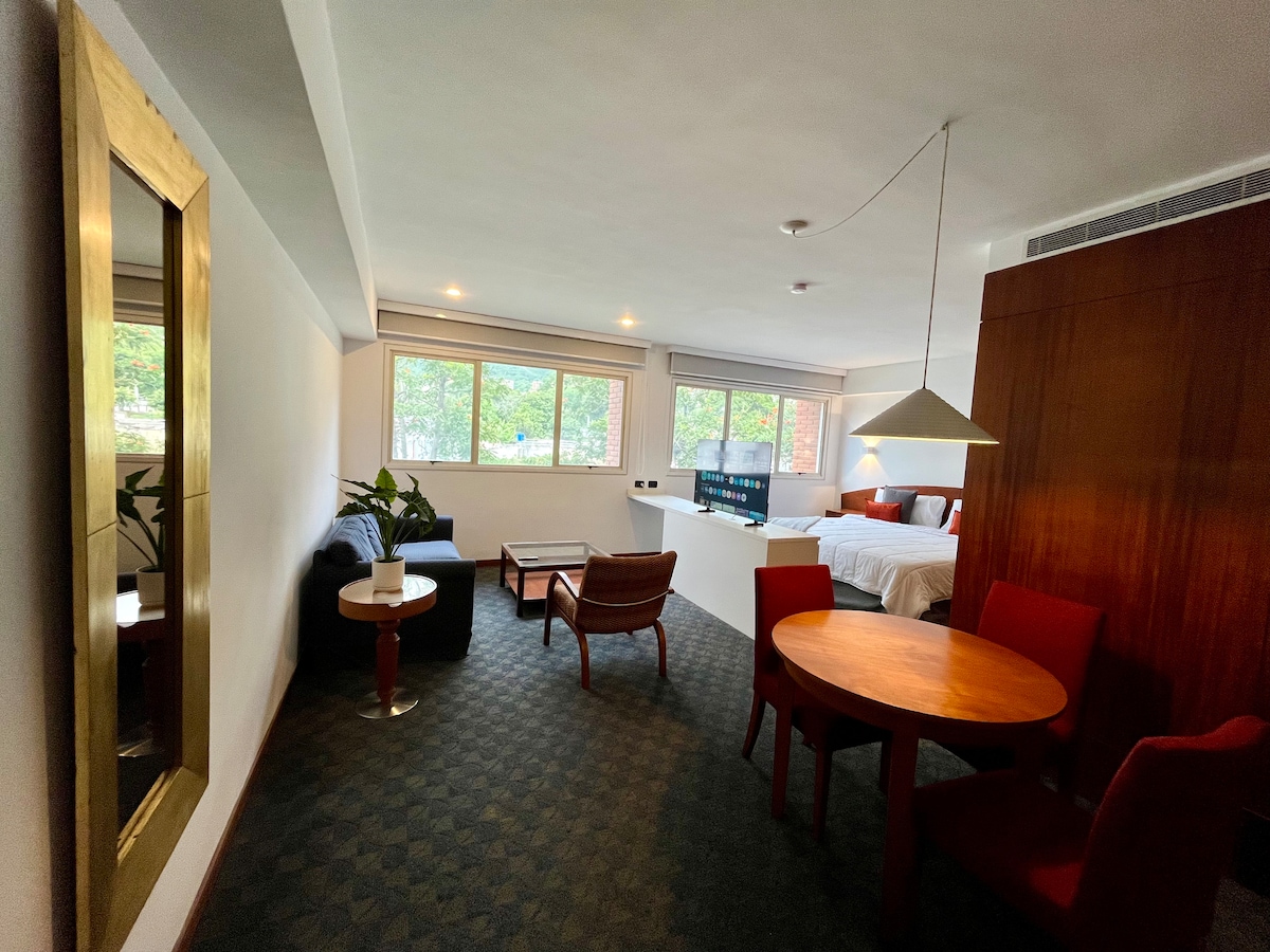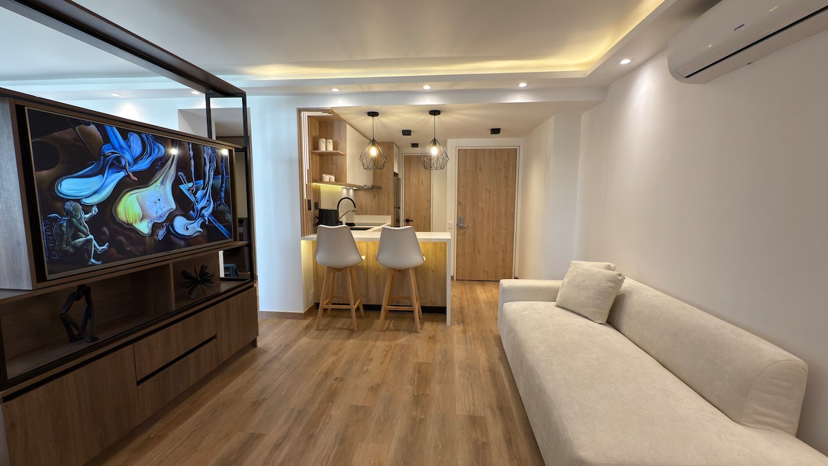 Disfruta una estadía cómoda y elegante en este moderno apartamento, totalmente equipado, ideal para viajeros ejecutivos, parejas o huéspedes que buscan confort, seguridad y excelente ubicación. El espacio cuenta con acabados de alto nivel, iluminación moderna, áreas integradas tipo hotel, espectaculares areas verdes, piscina climatizada, jacuzzi, terraza y una increíble vista panorámica 360° a la ciudad y la montaña.