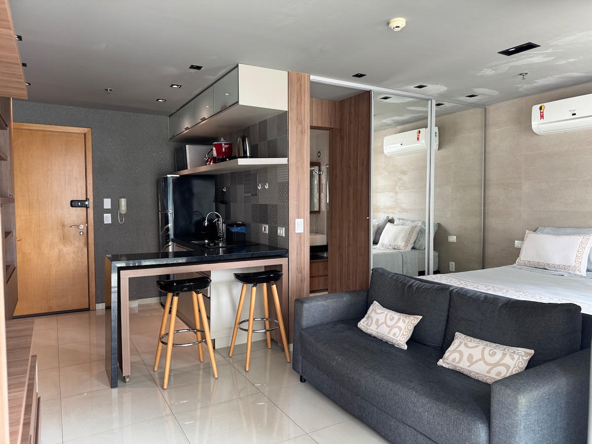 Apartamento de luxo no DF Plaza, em Águas Claras, ideal para casais ou executivos. Possui cama queen, sofá-cama, ar-condicionado, Wi-Fi e cozinha equipada. Decoração moderna e funcional. Localizado dentro do shopping, com acesso a restaurantes, supermercado, farmácia e academia. O prédio oferece piscina, lavanderia, estacionamento gratuito e portaria 24h. Conforto e praticidade em ótima localização.
