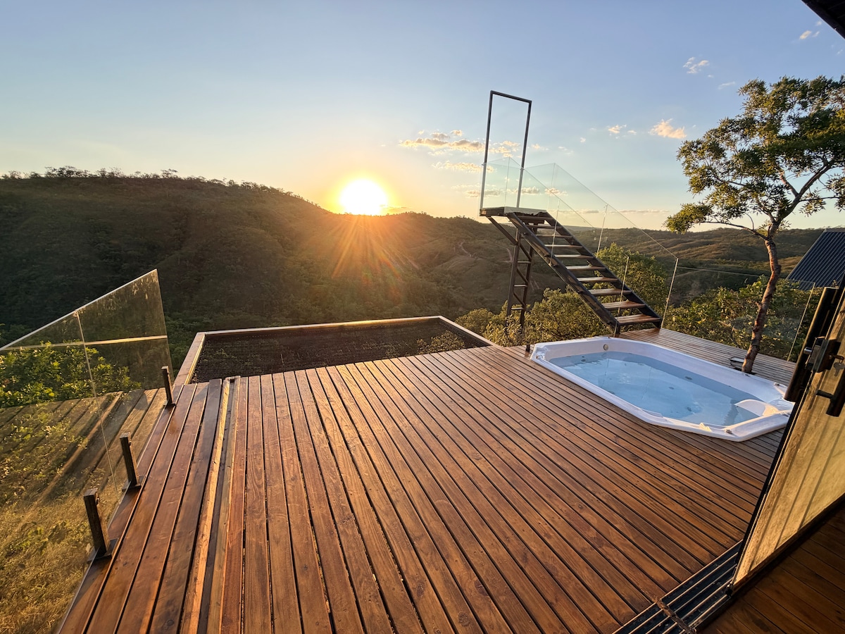 Nosso Bangalô tem uma Jacuzzi grande com aquecimento a gás para o período da noite e solar durante o dia (mantendo a água sempre quente) um pôr do sol incrível, cama com trilhos que sai para fora do quarto com um colchão queen super confortável com molas ensacadas , um banheiro rústico lindo com torneira e chuveiro que sai do teto, projetor de cinema e uma cozinha em formato de ilha de frente para a vista das montanhas. Tudo isso bem pertinho da cidade a 2 km de estrada de chão.