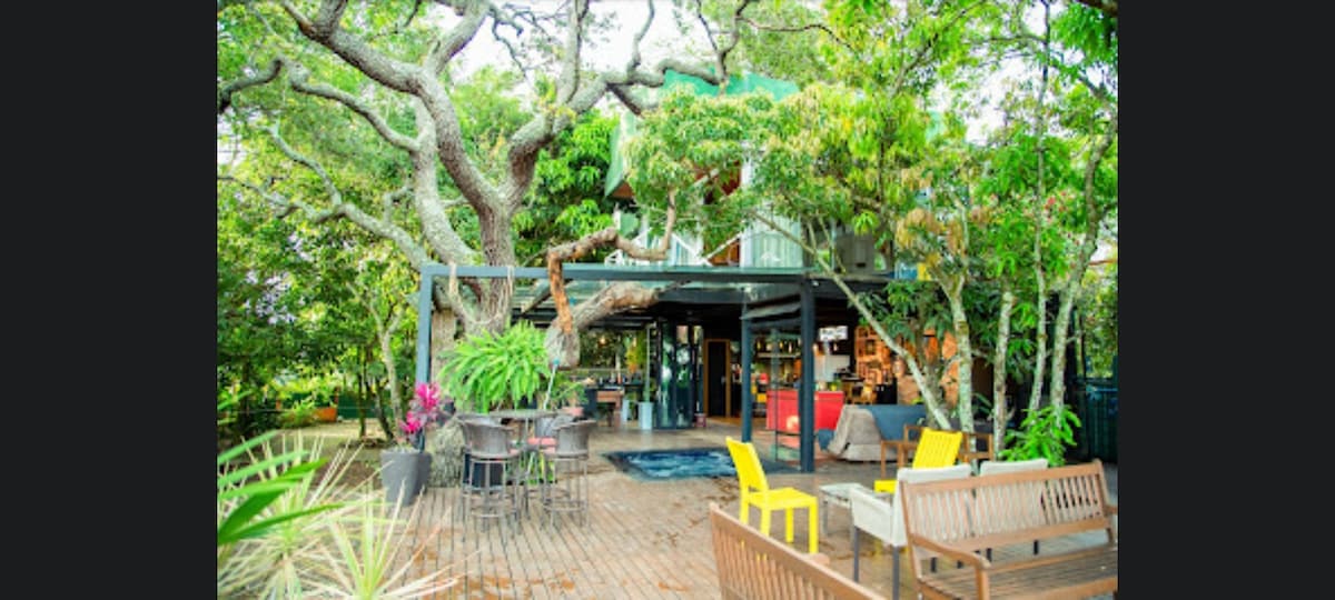De acabamento rústico, a Casa de Vidro está construída entre árvores nativas e frutíferas que já existiam no local, preservando a natureza e beleza do lugar. Possui área de lazer (deck, jacuzzi, churrasqueira e telão) integrada à cozinha e à sala de estar, deixando tudo muito amplo, prático e agradável. Na área íntima, tem duas confortáveis suítes e um terceiro ambiente que, sendo uma pequena sala de vídeo, também pode se transformar noutra suíte, compartilhando o banheiro com a área social.