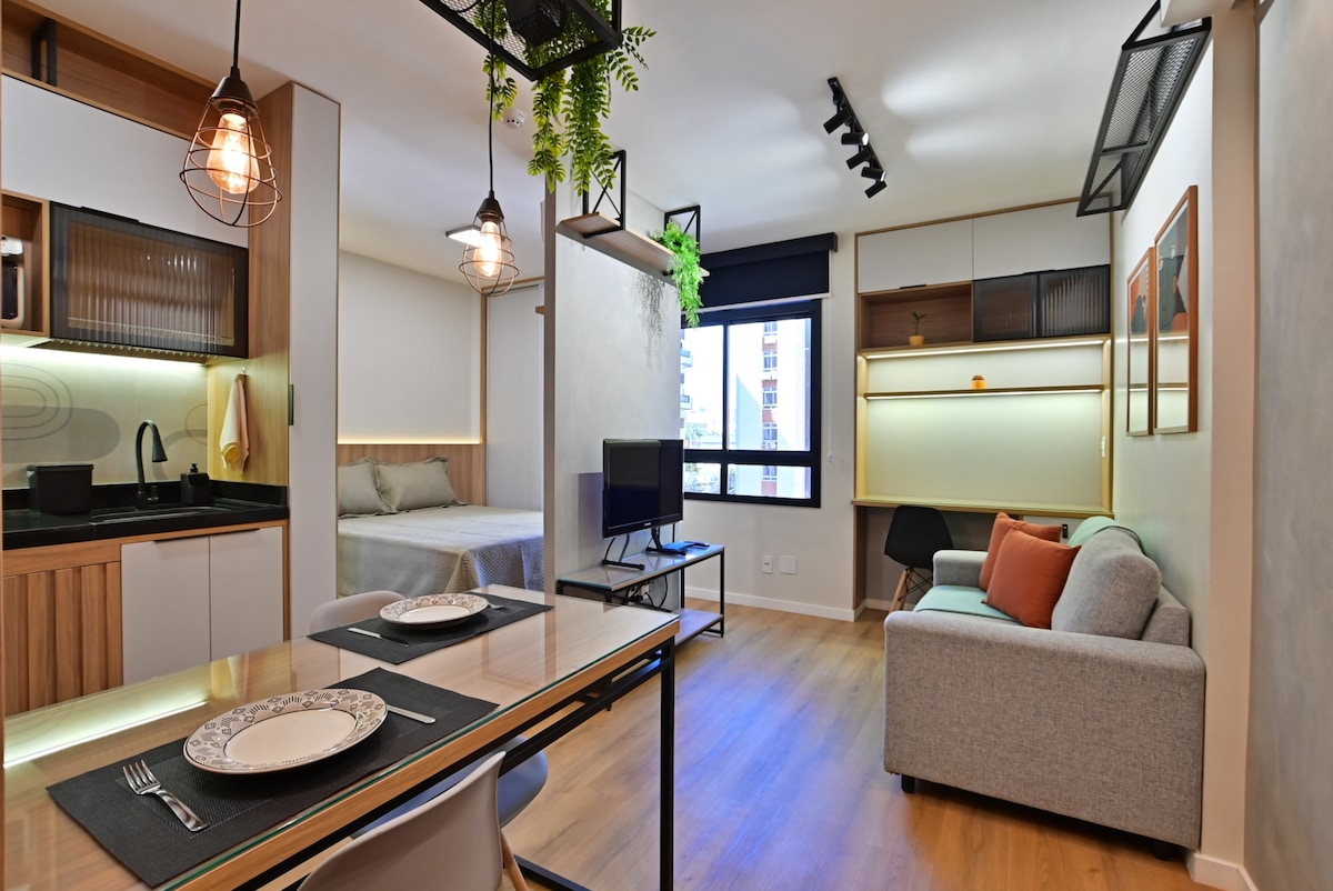 Ideal para quem busca um ambiente moderno, aconchegante e seguro. -AR condicionado ❄️ -Portaria 24h🚨 -Fechadura eletrônica 📱 -1 vaga inclusa🚙 (tag 15,00 adicional) -Wi-Fi com ótima velocidade 🛜 -Há um Mercadinho (muito bom) 🍕 -Ampla disponibilidade de Uber -Cama confortável 🛏️ -Sofá cama casal (confortável pra duas pessoas) Roupa de cama/banho Cozinha bem equipada (Air Fryer, filtro de água, micro-ondas, lava e seca), TV Smart na sala e quarto, lindo banheiro e uma bela varanda.