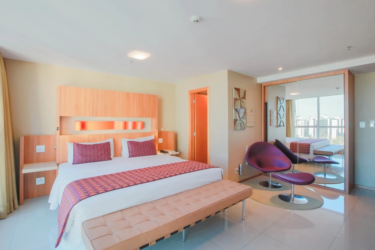 Experimente o requinte do Hotel Let's Idea Brasília, onde sofisticação e conforto se encontram em cada detalhe. O ambiente foi cuidadosamente decorado e oferece cama King, ar-condicionado, Wi-Fi, TV, Netflix e cozinha. Desfrute ainda das comodidades do hotel, recepção 24h, garagem privativa e limpeza diária, além de piscina e academia, elevando sua estadia a um padrão superior. Localizado próximo a shoppings, restaurantes e atrações, é a escolha ideal para quem valoriza conforto e praticidade.
