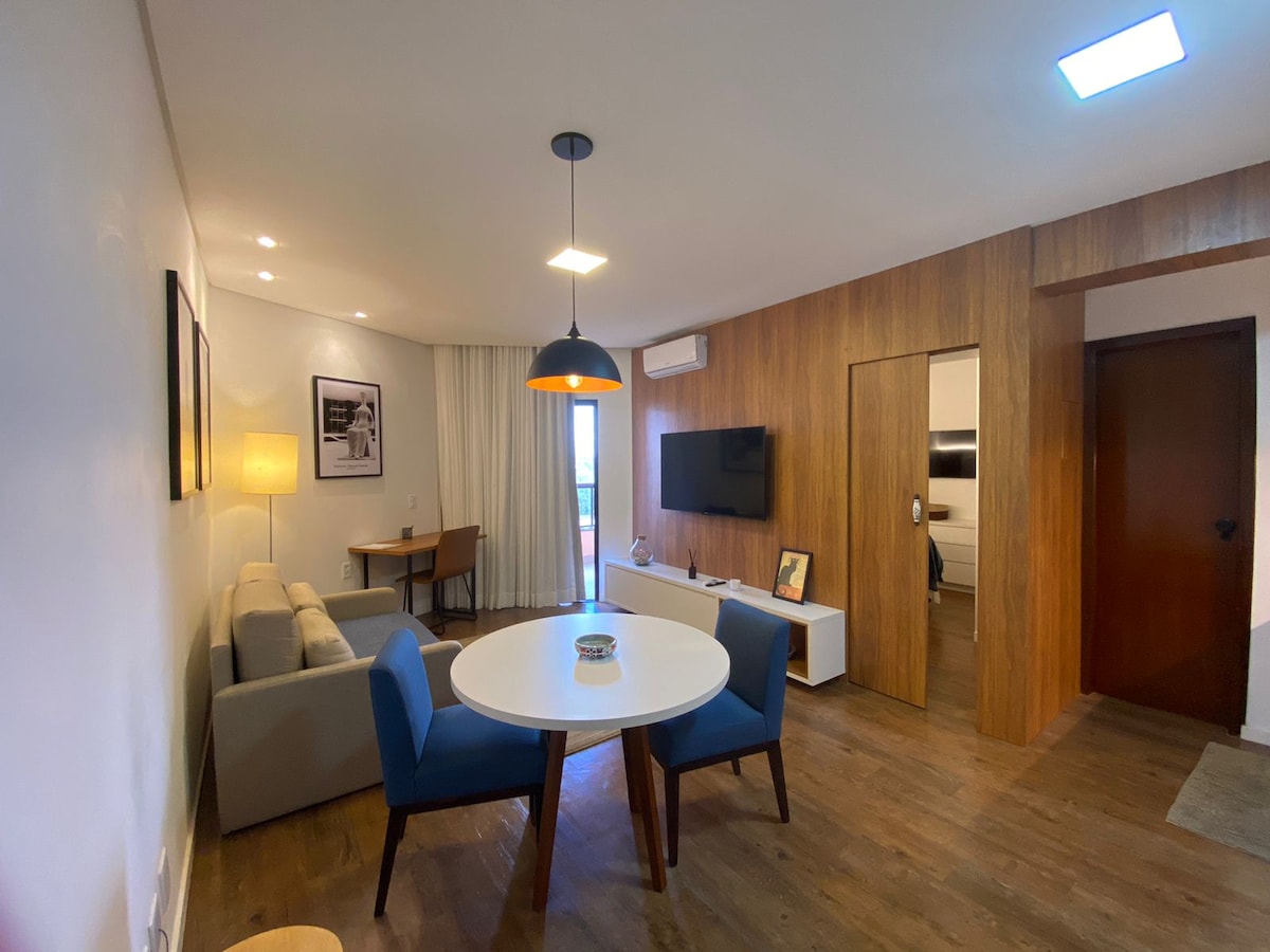 Apartamento no Life Resort, em frente ao Lago Paranoá, jardim e piscinas, decorado para o bem-estar dos hóspedes, com mobiliário novo, cama-box queen, frigobar, tv de 50", cafeteira Nespresso, filtro com água gelada, armários e suporte para mala, ferro de passar, secador de cabelo, berço desmontável (sob solicitação), coktop, microondas, pratos, copos, talheres, panelas e utensílios. Como cortesia: mini sabonete, shampoo e condicionador, roupa de cama e banho, produtos de limpeza e WiFi.