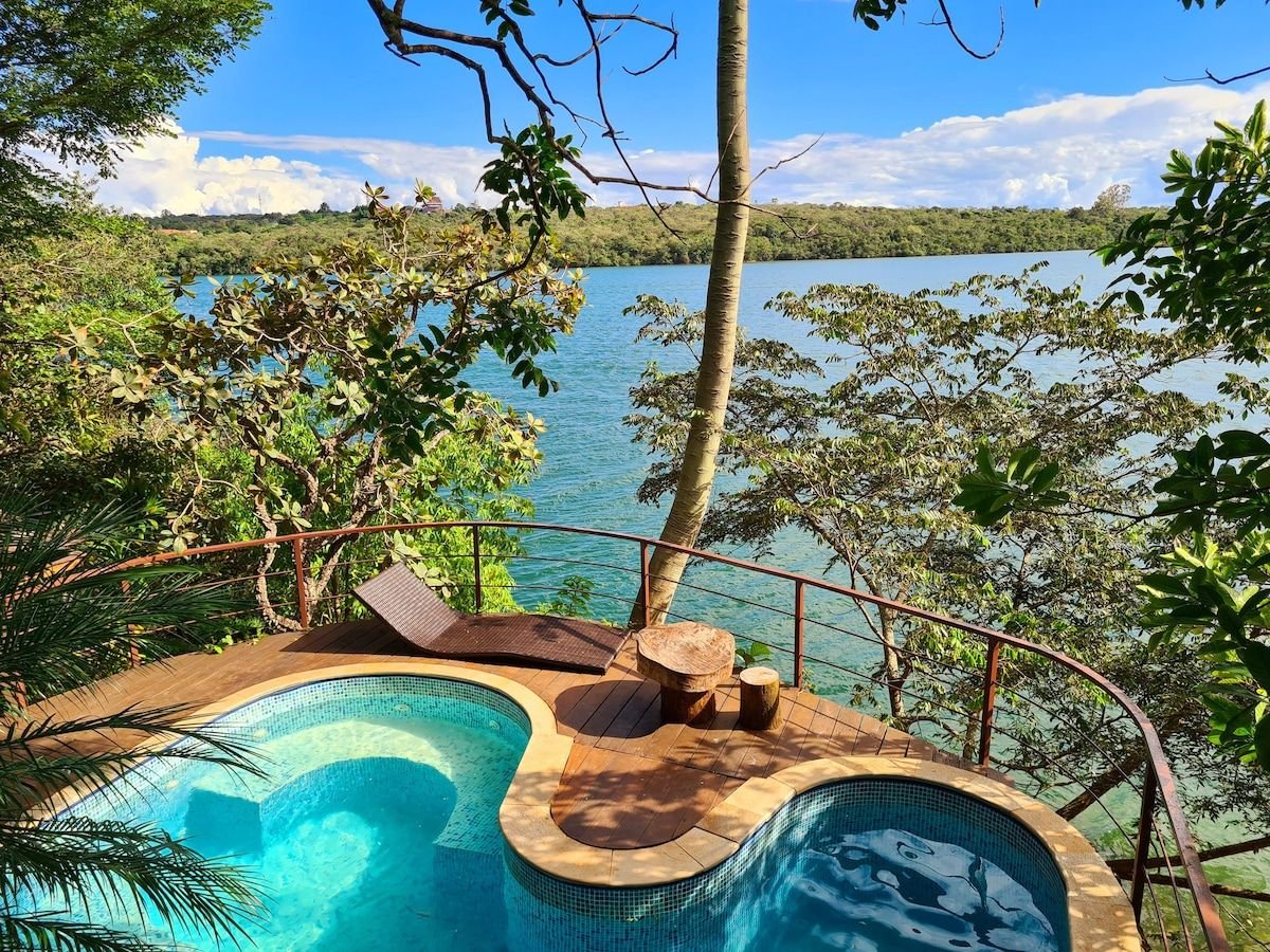 Microcasa madeira e beira do lago Paranoá, rústico, integrado a natureza e a topografia local, chegada lancha ou barco , Uber ou carro. Alta gastronomia disponível. Sauna úmida, piscina privativa aquecida temp média de 28 graus, ofuro e praça fogo. Vista inigualável. Atenção: compartimento vaso sanitário acessado escada e externo a casa. Chuveiro e pia interna casa, ar condicionado, Frigobar, Adega Climatizada, Cooktop 1 boca, Forno elétrico, Grill. Não indicado pessoas dificuldade locomoção.