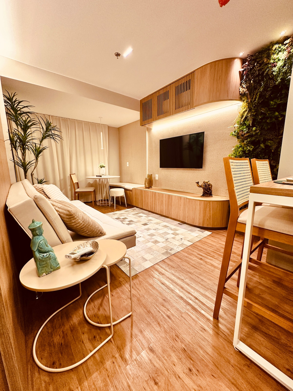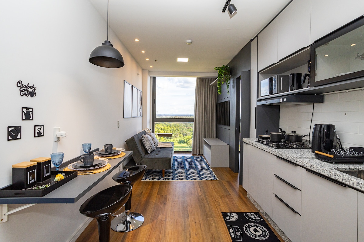 Apartamento no Life Resort, em frente ao Lago Paranoá, jardim e piscinas, decorado para o bem-estar dos hóspedes, com mobiliário novo, cama-box queen, frigobar, tv de 50", cafeteira Nespresso, filtro com água gelada, armários e suporte para mala, ferro de passar, secador de cabelo, berço desmontável (sob solicitação), coktop, microondas, pratos, copos, talheres, panelas e utensílios. Como cortesia: mini sabonete, shampoo e condicionador, roupa de cama e banho, produtos de limpeza e WiFi.